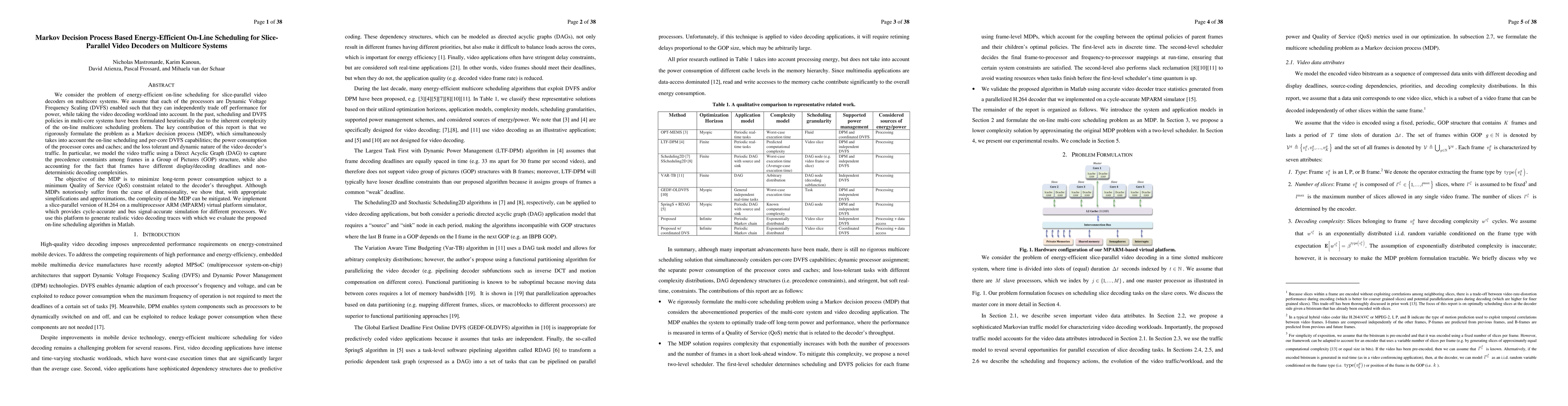 We consider the problem of energy-efficient on-line scheduling for slice-parallel video decoders on multicore systems. We assume that each of the processors are Dynamic Voltage Frequency Scaling (DVFS) enabled such that they can independently trade off performance for power, while taking the video decoding workload into account. In the past, scheduling and DVFS policies in multi-core systems have been formulated heuristically due to the inherent complexity of the on-line multicore scheduling problem. The key contribution of this report is that we rigorously formulate the problem as a Markov decision process (MDP), which simultaneously takes into account the on-line scheduling and per-core DVFS capabilities; the power consumption of the processor cores and caches; and the loss tolerant and dynamic nature of the video decoder's traffic. In particular, we model the video traffic using a Direct Acyclic Graph (DAG) to capture the precedence constraints among frames in a Group of Pictures (GOP) structure, while also accounting for the fact that frames have different display/decoding deadlines and non-deterministic decoding complexities. The objective of the MDP is to minimize long-term power consumption subject to a minimum Quality of Service (QoS) constraint related to the decoder's throughput. Although MDPs notoriously suffer from the curse of dimensionality, we show that, with appropriate simplifications and approximations, the complexity of the MDP can be mitigated. We implement a slice-parallel version of H.264 on a multiprocessor ARM (MPARM) virtual platform simulator, which provides cycle-accurate and bus signal-accurate simulation for different processors. We use this platform to generate realistic video decoding traces with which we evaluate the proposed on-line scheduling algorithm in Matlab.