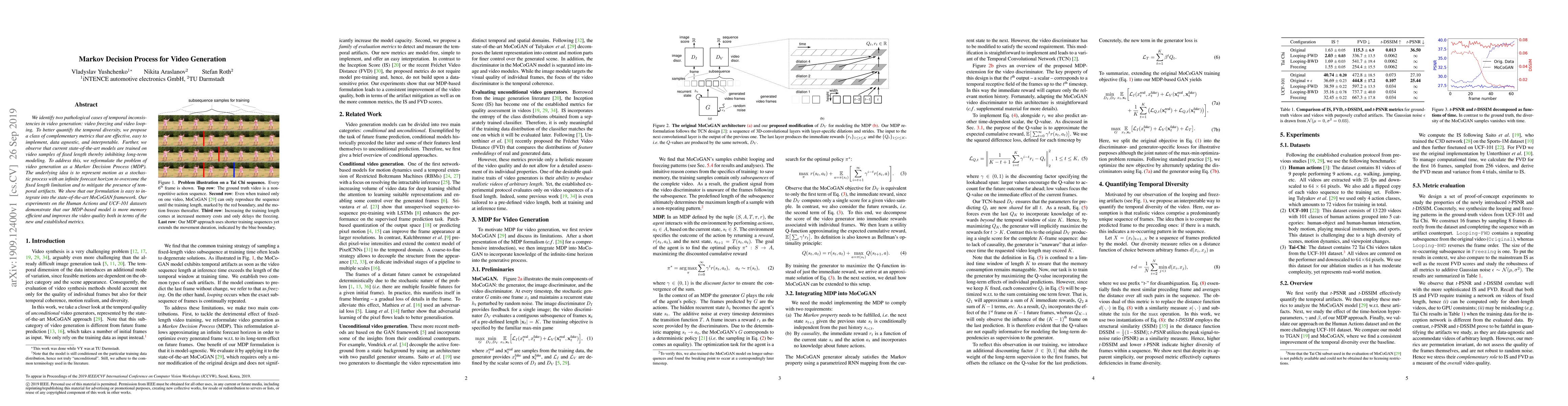 We identify two pathological cases of temporal inconsistencies in video generation: video freezing and video looping. To better quantify the temporal diversity, we propose a class of complementary metrics that are effective, easy to implement, data agnostic, and interpretable. Further, we observe that current state-of-the-art models are trained on video samples of fixed length thereby inhibiting long-term modeling. To address this, we reformulate the problem of video generation as a Markov Decision Process (MDP). The underlying idea is to represent motion as a stochastic process with an infinite forecast horizon to overcome the fixed length limitation and to mitigate the presence of temporal artifacts. We show that our formulation is easy to integrate into the state-of-the-art MoCoGAN framework. Our experiments on the Human Actions and UCF-101 datasets demonstrate that our MDP-based model is more memory efficient and improves the video quality both in terms of the new and established metrics.