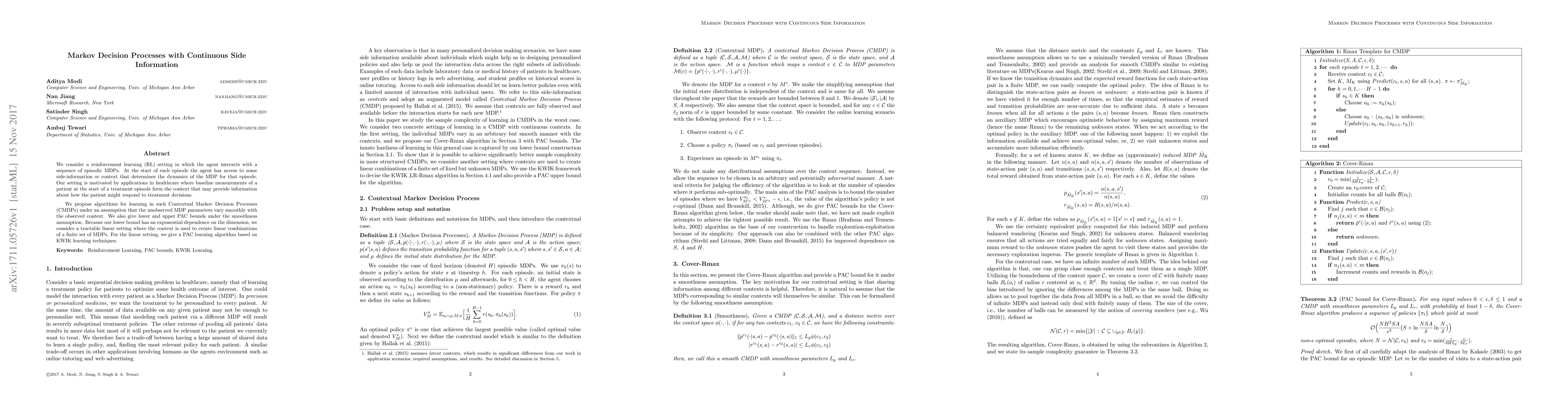 This paper proposes algorithms for learning in Contextual Markov Decision Processes (CMDPs) where side information influences MDP dynamics, motivated by healthcare applications. It provides PAC bounds and introduces a linear setting with a KWIK-based learning algorithm for tractability.