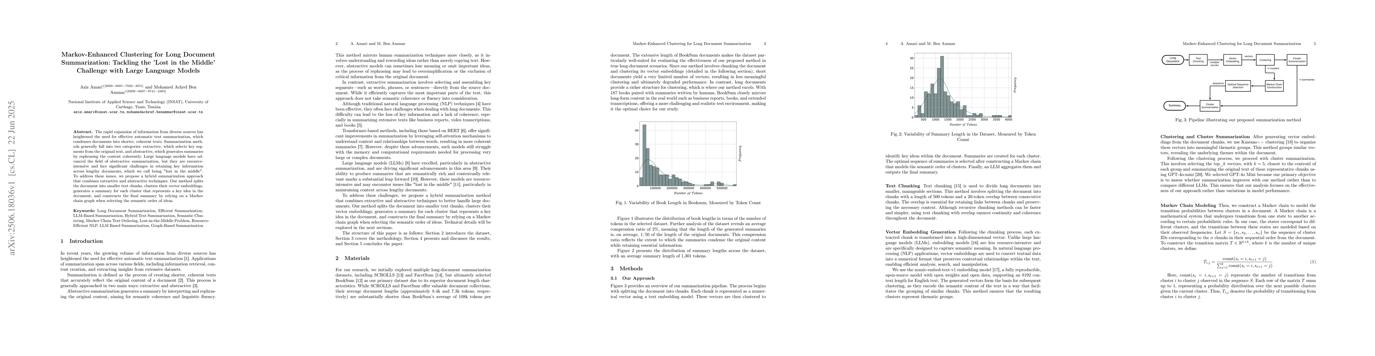 The rapid expansion of information from diverse sources has heightened the need for effective automatic text summarization, which condenses documents into shorter, coherent texts. Summarization methods generally fall into two categories: extractive, which selects key segments from the original text, and abstractive, which generates summaries by rephrasing the content coherently. Large language models have advanced the field of abstractive summarization, but they are resourceintensive and face significant challenges in retaining key information across lengthy documents, which we call being "lost in the middle". To address these issues, we propose a hybrid summarization approach that combines extractive and abstractive techniques. Our method splits the document into smaller text chunks, clusters their vector embeddings, generates a summary for each cluster that represents a key idea in the document, and constructs the final summary by relying on a Markov chain graph when selecting the semantic order of ideas.