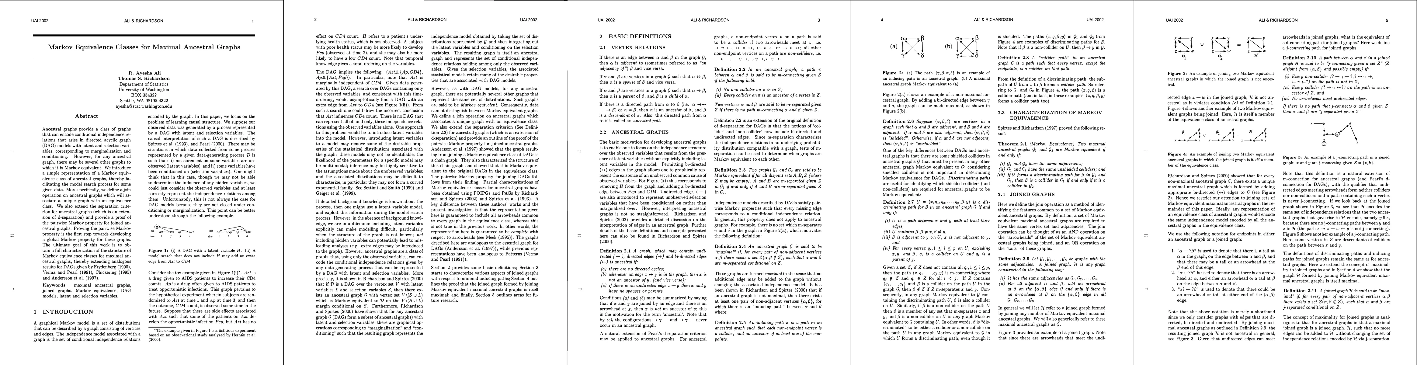 Ancestral graphs are a class of graphs that encode conditional independence relations arising in DAG models with latent and selection variables, corresponding to marginalization and conditioning. However, for any ancestral graph, there may be several other graphs to which it is Markov equivalent. We introduce a simple representation of a Markov equivalence class of ancestral graphs, thereby facilitating model search. \ More specifically, we define a join operation on ancestral graphs which will associate a unique graph with a Markov equivalence class. We also extend the separation criterion for ancestral graphs (which is an extension of d-separation) and provide a proof of the pairwise Markov property for joined ancestral graphs.