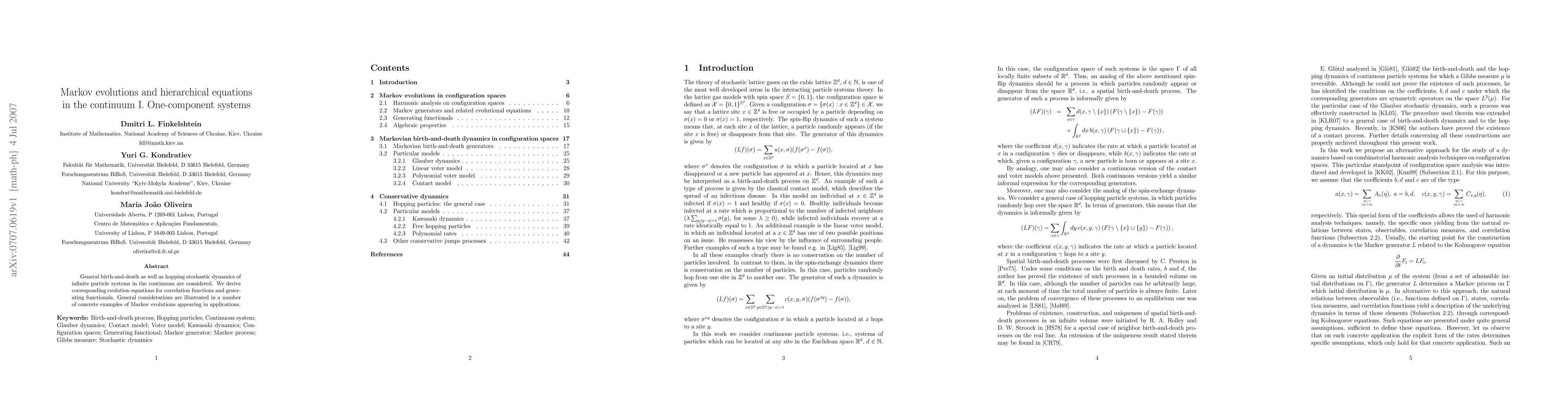 General birth-and-death as well as hopping stochastic dynamics of infinite particle systems in the continuum are considered. We derive corresponding evolution equations for correlation functions and generating functionals. General considerations are illustrated in a number of concrete examples of Markov evolutions appearing in applications.