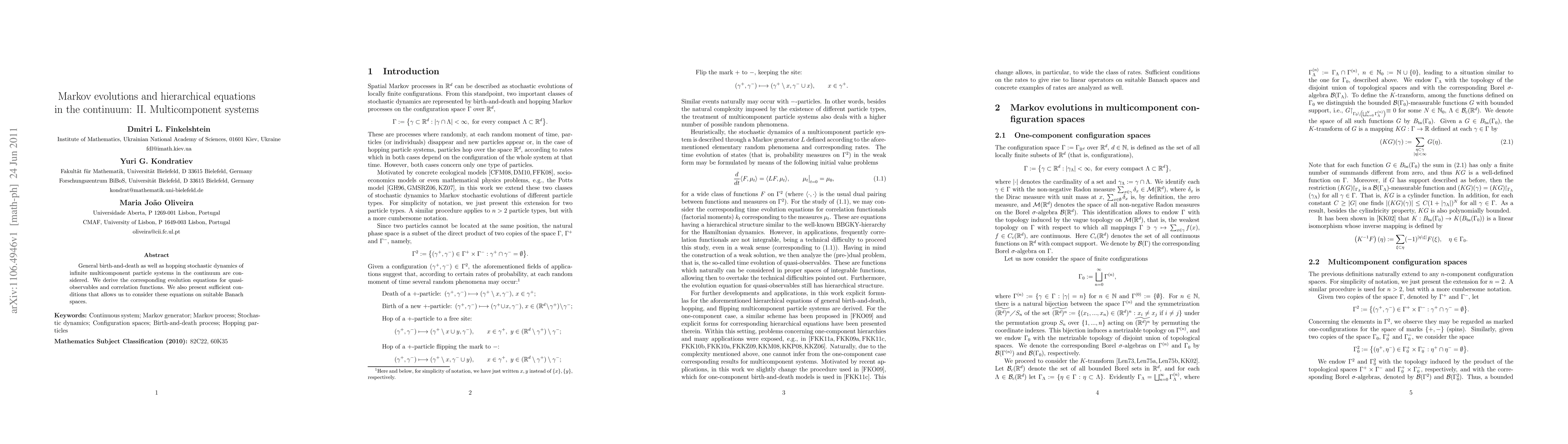 General birth-and-death as well as hopping stochastic dynamics of infinite multicomponent particle systems in the continuum are considered. We derive the corresponding evolution equations for quasi-observables and correlation functions. We also present sufficient conditions that allows us to consider these equations on suitable Banach spaces.