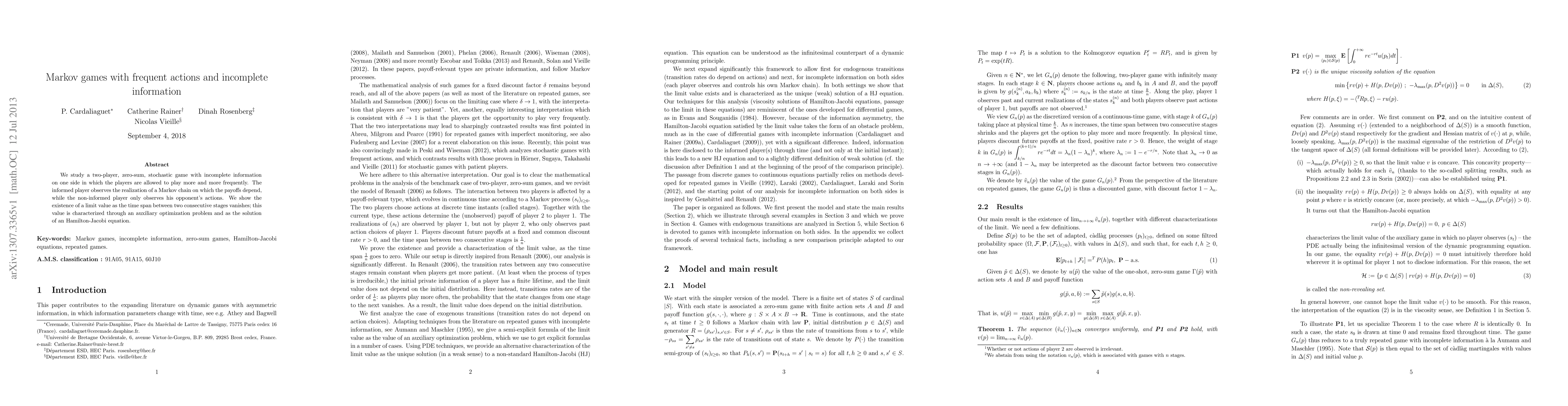 We study a two-player, zero-sum, stochastic game with incomplete information on one side in which the players are allowed to play more and more frequently. The informed player observes the realization of a Markov chain on which the payoffs depend, while the non-informed player only observes his opponent's actions. We show the existence of a limit value as the time span between two consecutive stages vanishes; this value is characterized through an auxiliary optimization problem and as the solution of an Hamilton-Jacobi equation.
