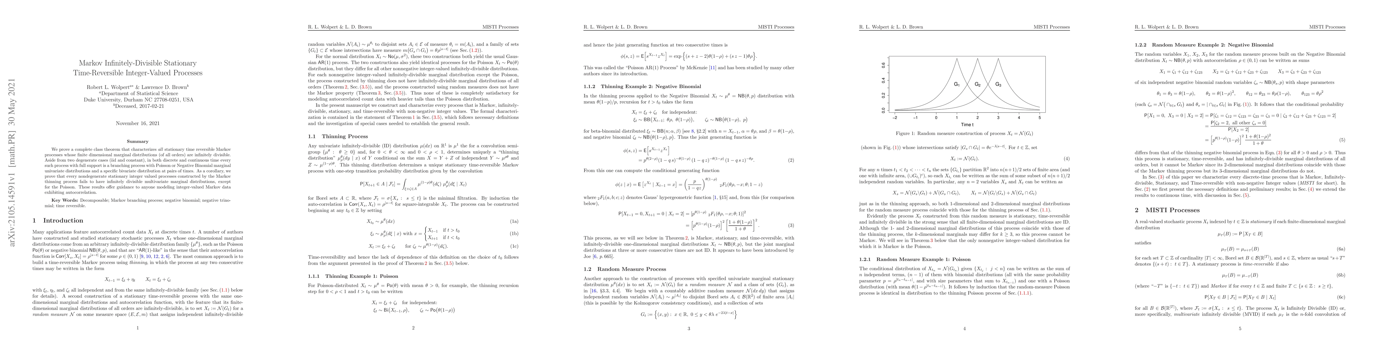 This paper proves a complete class theorem for stationary time-reversible Markov processes with infinitely divisible marginal distributions, showing that such processes are branching processes with Poisson or Negative Binomial distributions. It also demonstrates that Markov thinning processes fail to produce infinitely divisible multivariate marginals, except for the Poisson case.