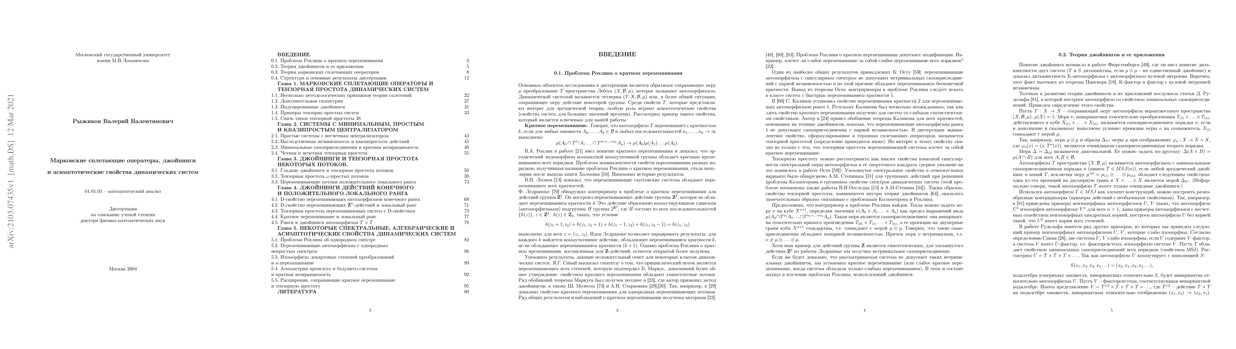 This text is written based on the author's publications during the period from 1991 to 2001. The work is devoted to the theory of Markov intertwining operators and joinings of measure-preserving group actions, as well as to their applications to study asymptotic properties of dynamical systems. Special attention is paid to Rokhlin's problems on multiple mixing and multiple spectrum. The development of these topics over the past twenty years has not been discussed. In fact many results on joinings have frozen in time, many questions have remained open without losing their relevance, but probably have ceased to excite interest due to difficulties. For example, it is not known whether the minimal self-joinings of order 2 imply all orders? Is there a non-trivial pairwise independent joining for a weakly mixing system of zero entropy? What can be said about such joinings for transformations with small local rank? These questions are ripe for a long time, and the author reminds the reader about them, combining his story with numerous partial and related results.