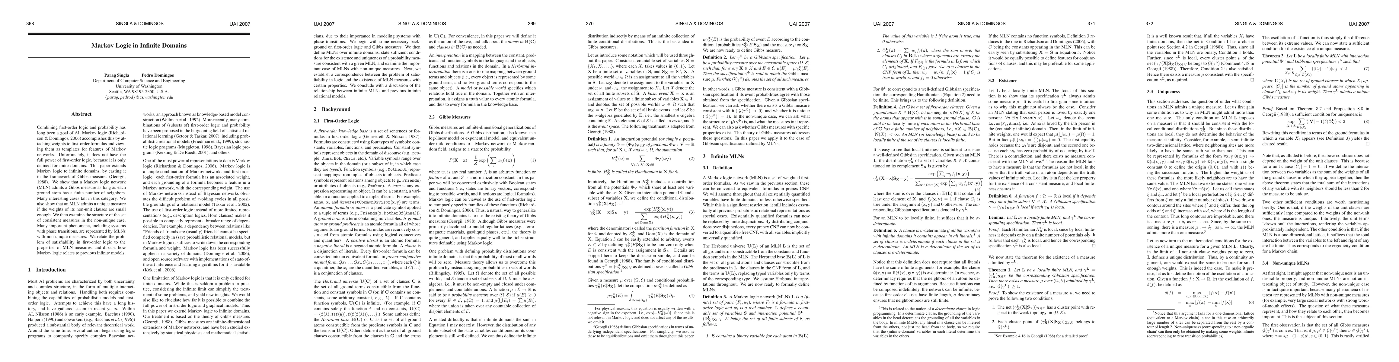 Combining first-order logic and probability has long been a goal of AI. Markov logic (Richardson & Domingos, 2006) accomplishes this by attaching weights to first-order formulas and viewing them as templates for features of Markov networks. Unfortunately, it does not have the full power of first-order logic, because it is only defined for finite domains. This paper extends Markov logic to infinite domains, by casting it in the framework of Gibbs measures (Georgii, 1988). We show that a Markov logic network (MLN) admits a Gibbs measure as long as each ground atom has a finite number of neighbors. Many interesting cases fall in this category. We also show that an MLN admits a unique measure if the weights of its non-unit clauses are small enough. We then examine the structure of the set of consistent measures in the non-unique case. Many important phenomena, including systems with phase transitions, are represented by MLNs with non-unique measures. We relate the problem of satisfiability in first-order logic to the properties of MLN measures, and discuss how Markov logic relates to previous infinite models.