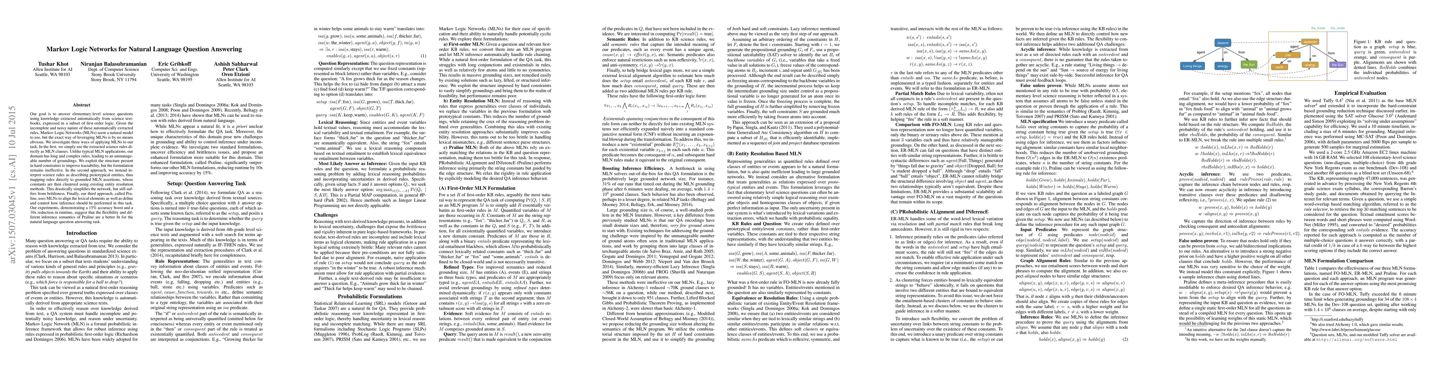 Our goal is to answer elementary-level science questions using knowledge extracted automatically from science textbooks, expressed in a subset of first-order logic. Given the incomplete and noisy nature of these automatically extracted rules, Markov Logic Networks (MLNs) seem a natural model to use, but the exact way of leveraging MLNs is by no means obvious. We investigate three ways of applying MLNs to our task. In the first, we simply use the extracted science rules directly as MLN clauses. Unlike typical MLN applications, our domain has long and complex rules, leading to an unmanageable number of groundings. We exploit the structure present in hard constraints to improve tractability, but the formulation remains ineffective. In the second approach, we instead interpret science rules as describing prototypical entities, thus mapping rules directly to grounded MLN assertions, whose constants are then clustered using existing entity resolution methods. This drastically simplifies the network, but still suffers from brittleness. Finally, our third approach, called Praline, uses MLNs to align the lexical elements as well as define and control how inference should be performed in this task. Our experiments, demonstrating a 15\% accuracy boost and a 10x reduction in runtime, suggest that the flexibility and different inference semantics of Praline are a better fit for the natural language question answering task.