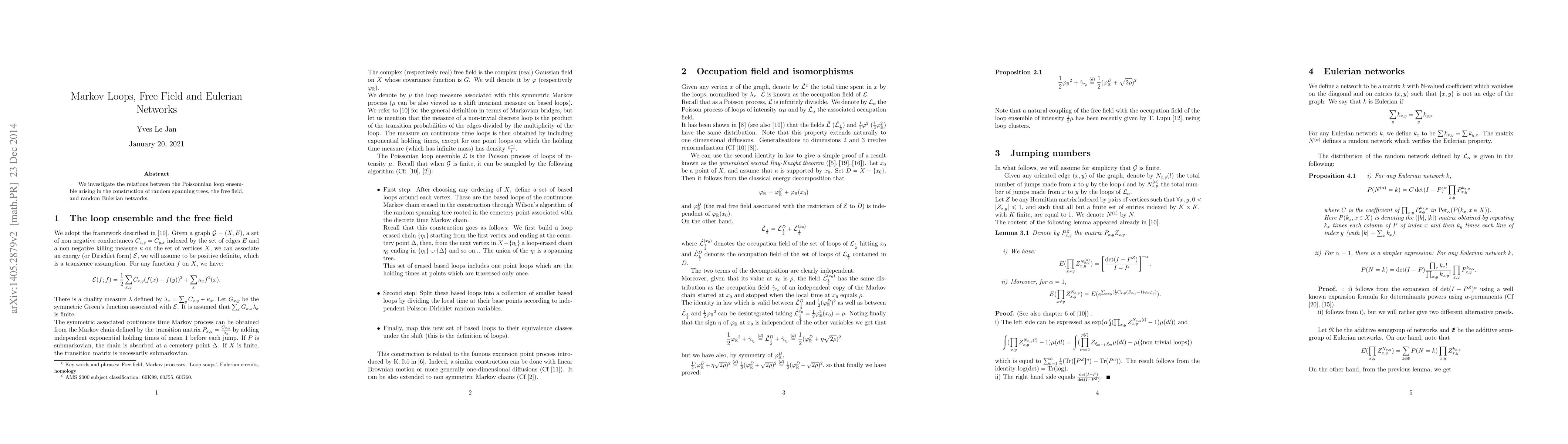 We study the complex free field associated with a symmetric Markov chain. Applications are given to loop ensembles, second Ray Knight theorem and random Eulerian circuits.
