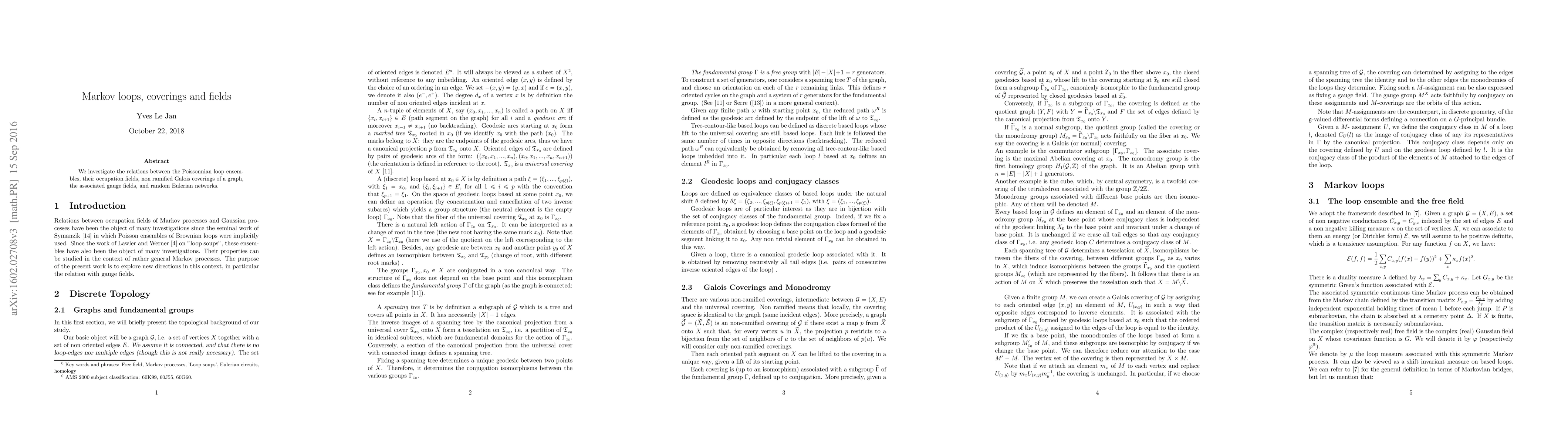 We investigate the relations between the Poissonnian loop ensembles , their occupation fields, non ramified Galois coverings of a graph, the associated gauge fields, and random Eulerian networks.