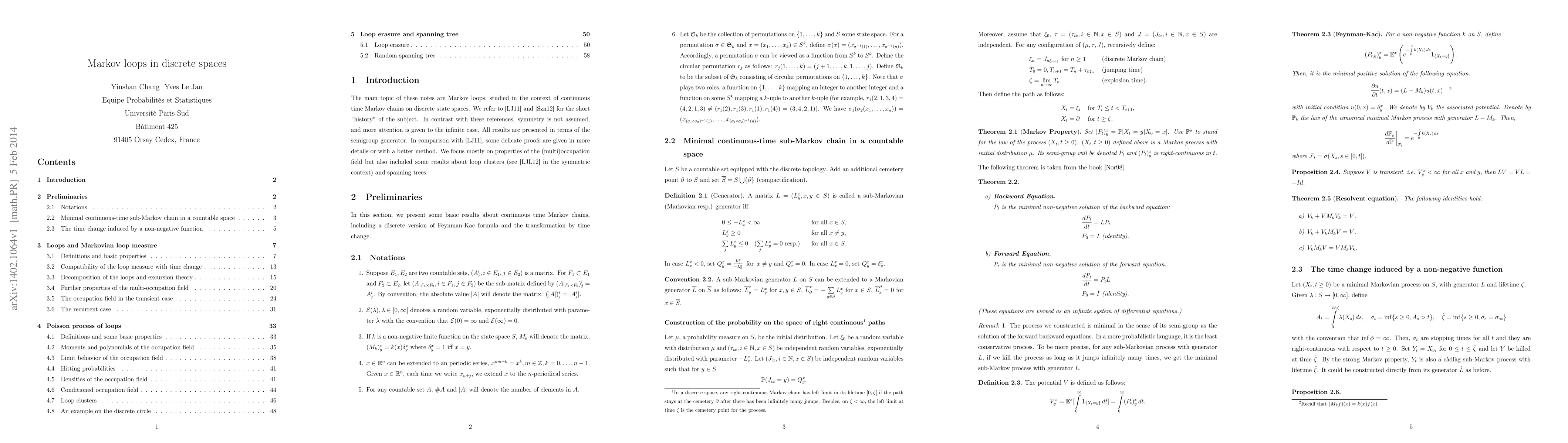 The main topic of these notes are Markov loops, studied in the context of continuous time Markov chains on discrete state spaces. We refer to [1] and [2] for the short "history" of the subject. In contrast with these references, symmetry is not assumed, and more attention is given to the infinite case. All results are presented in terms of the semigroup generator. In comparison with [1], some delicate proofs are given in more details or with a better method. We focus mostly on properties of the (multi)occupation field but also included some results about loop clusters (see [3] in the symmetric context) and spanning trees. [1] Markov paths, loops and fields, by Yves Le Jan, Lecture Notes in Mathematics, vol. 2026, Springer, Heidelberg, 2011 [2] Topics in occupation times and Gaussian free fields, by Alain-Sol Sznitman, Zurich Lectures in Advanced Mathematics, European Mathematical Society (EMS), Z\"urich, 2012 [3] Markovian loop clusters on graphs, by Yves Le Jan and Sophie Lemaire, Preprint, arxiv:1211.0300 [math.PR], 2012