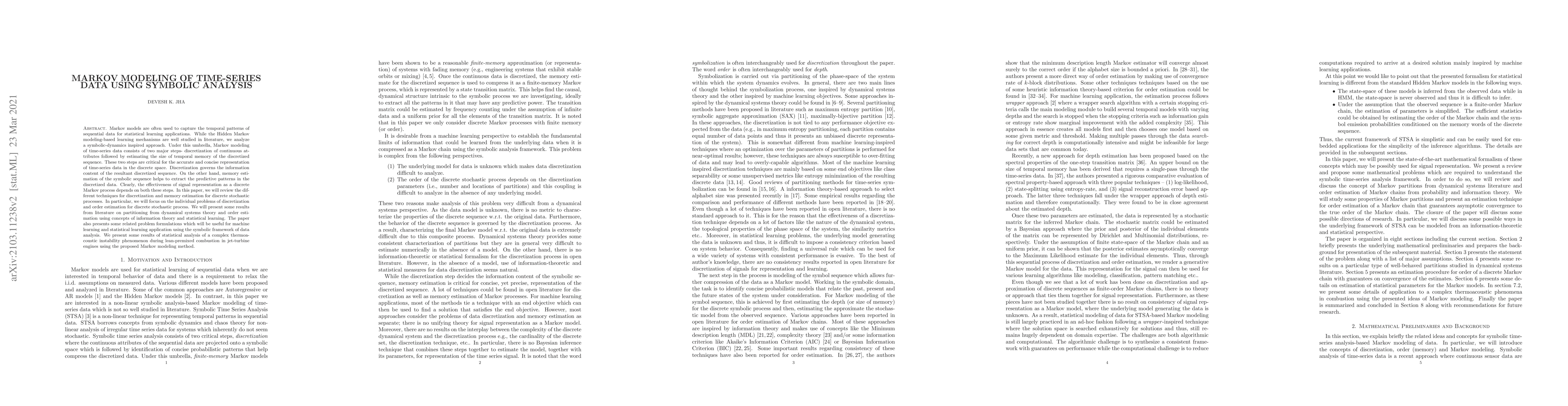 Markov models are often used to capture the temporal patterns of sequential data for statistical learning applications. While the Hidden Markov modeling-based learning mechanisms are well studied in literature, we analyze a symbolic-dynamics inspired approach. Under this umbrella, Markov modeling of time-series data consists of two major steps -- discretization of continuous attributes followed by estimating the size of temporal memory of the discretized sequence. These two steps are critical for the accurate and concise representation of time-series data in the discrete space. Discretization governs the information content of the resultant discretized sequence. On the other hand, memory estimation of the symbolic sequence helps to extract the predictive patterns in the discretized data. Clearly, the effectiveness of signal representation as a discrete Markov process depends on both these steps. In this paper, we will review the different techniques for discretization and memory estimation for discrete stochastic processes. In particular, we will focus on the individual problems of discretization and order estimation for discrete stochastic process. We will present some results from literature on partitioning from dynamical systems theory and order estimation using concepts of information theory and statistical learning. The paper also presents some related problem formulations which will be useful for machine learning and statistical learning application using the symbolic framework of data analysis. We present some results of statistical analysis of a complex thermoacoustic instability phenomenon during lean-premixed combustion in jet-turbine engines using the proposed Markov modeling method.