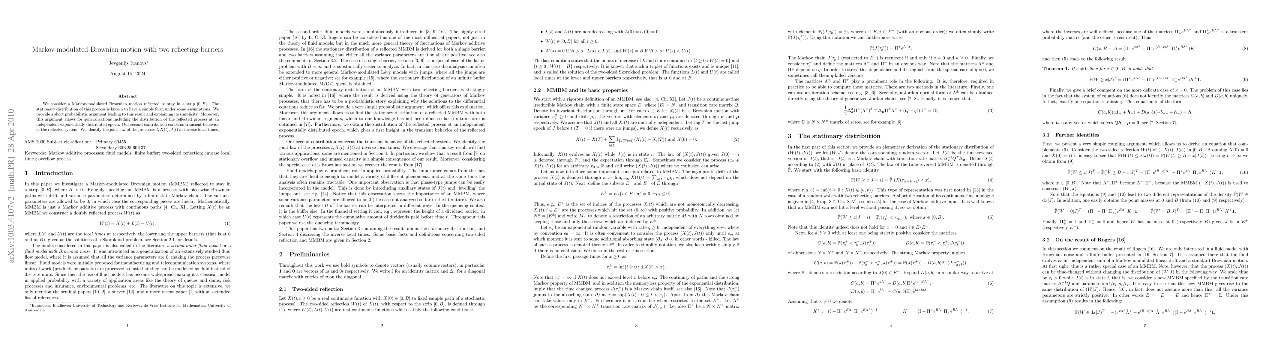 This paper studies a Markov-modulated Brownian motion reflected within the strip [0,B], deriving a simple stationary distribution through a concise probabilistic argument. It also explores the transient behavior and the joint law of the process at inverse local times.