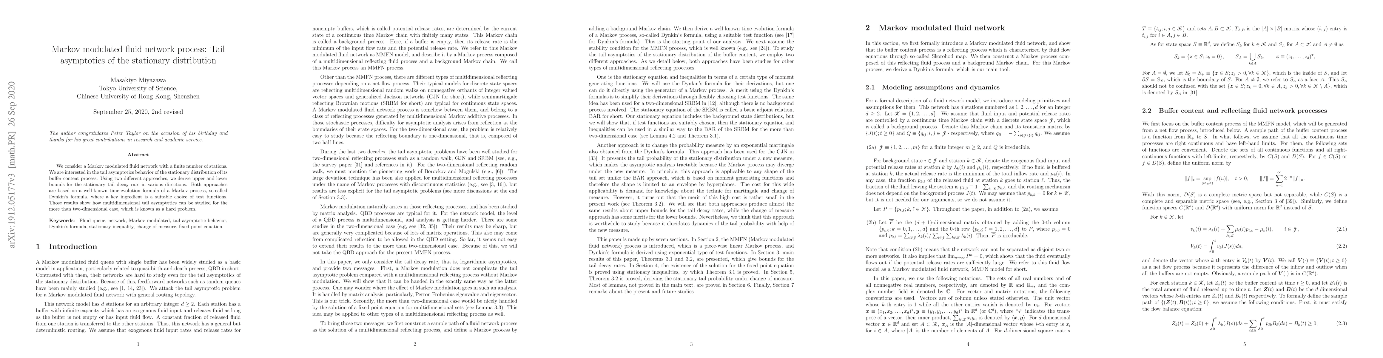 This paper investigates the tail asymptotics of the stationary distribution for a Markov modulated fluid network with multiple stations, deriving upper and lower bounds for the tail decay rate using Dynkin's formula and suitable test functions. The study demonstrates a method for analyzing multidimensional tail behavior in higher-dimensional cases.