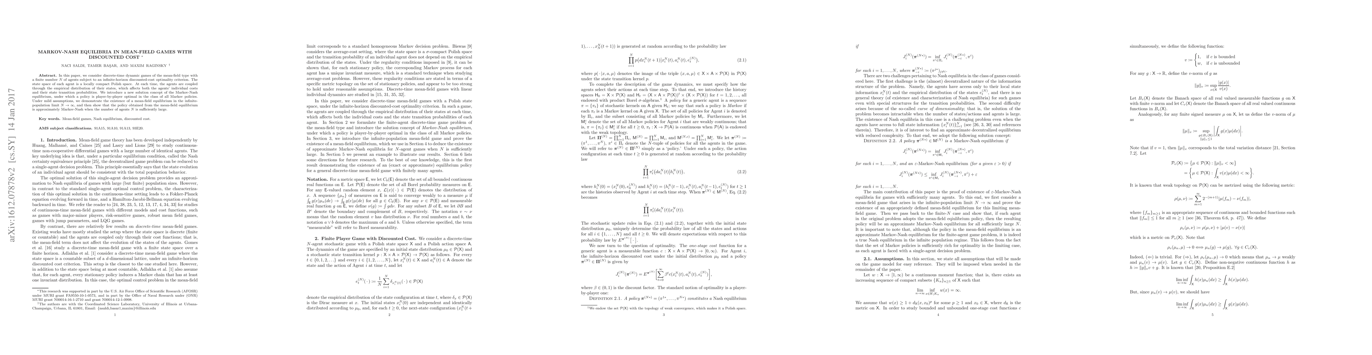 This paper explores Markov-Nash equilibria in mean-field games with discounted costs, demonstrating the existence of such equilibria in the infinite-population limit and showing that these policies approximate Markov-Nash equilibria for large but finite populations.