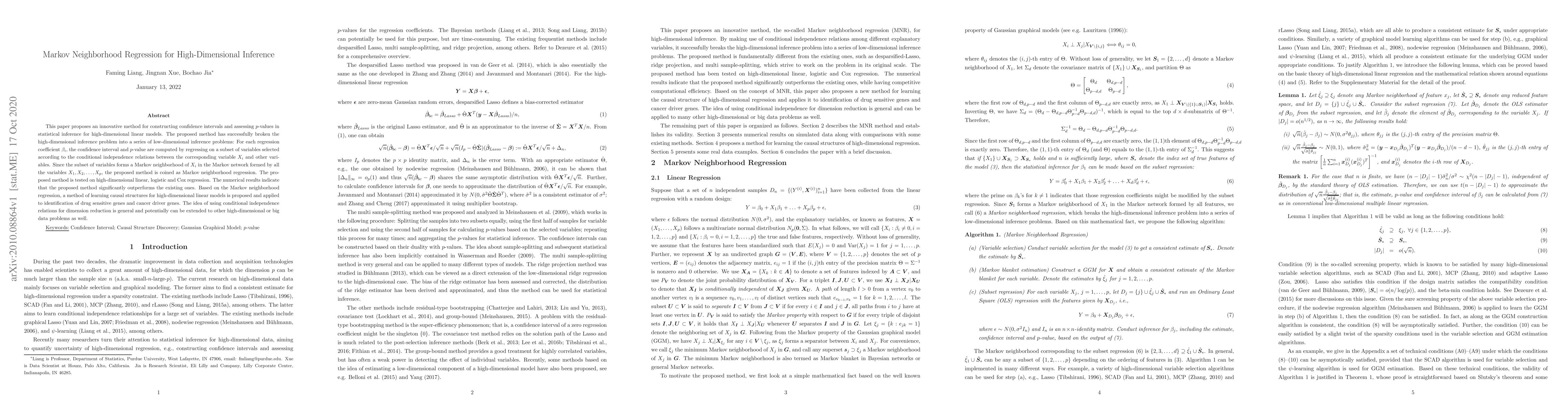 This paper introduces Markov neighborhood regression, a method for high-dimensional inference that breaks down complex problems into manageable low-dimensional subsets based on conditional independence relations, significantly outperforming existing methods in various regression models. The approach also enables the identification of causal structures and applications in genomics.