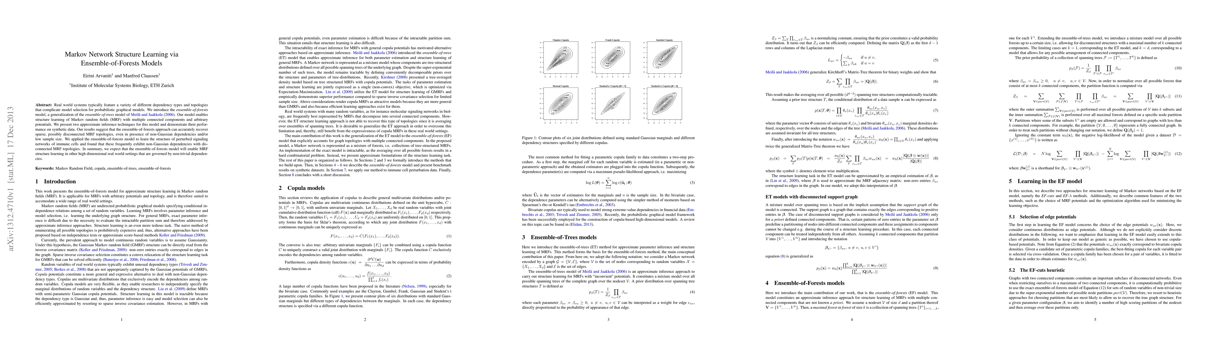 Researchers introduced an ensemble-of-forests model to learn Markov network structures from complex data, achieving accurate results even with non-Gaussian dependencies and low sample sizes.