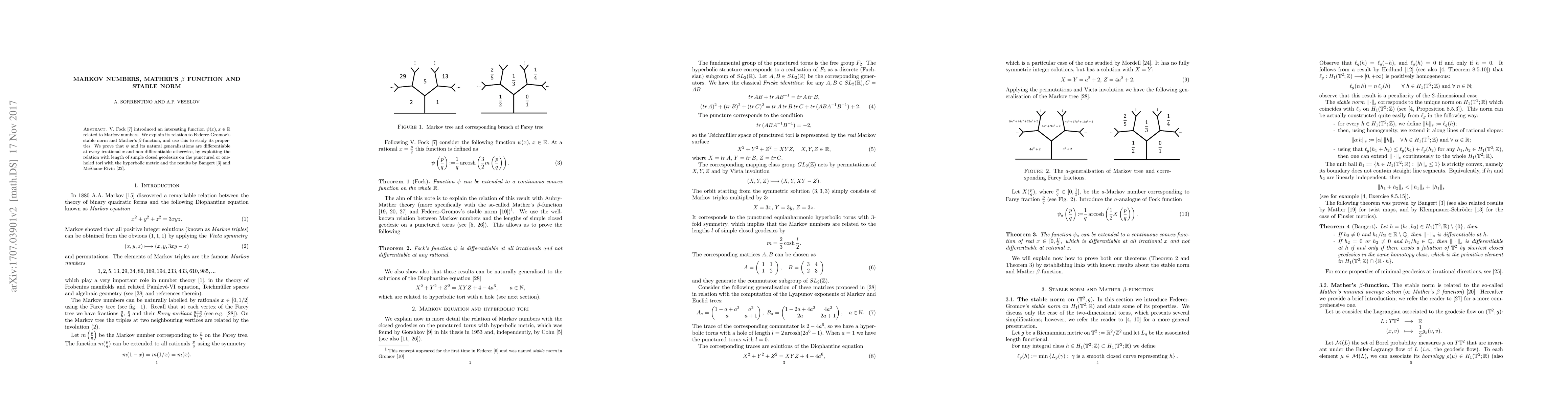 V. Fock [7] introduced an interesting function $\psi(x)$, $x \in {\mathbb R}$ related to Markov numbers. We explain its relation to Federer-Gromov's stable norm and Mather's $\beta$-function, and use this to study its properties. We prove that $\psi$ and its natural generalisations are differentiable at every irrational $x$ and non-differentiable otherwise, by exploiting the relation with length of closed geodesics on the punctured or one-hole tori with the hyperbolic metric and the results by Bangert [3] and McShane- Rivin [19].