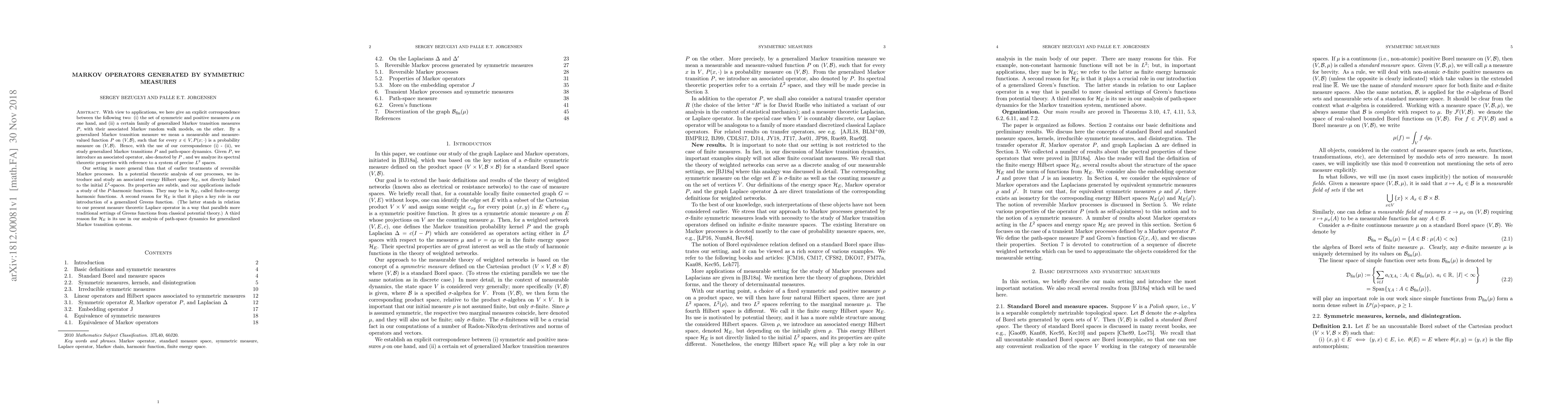 With view to applications, we here give an explicit correspondence between the following two: (i) the set of symmetric and positive measures $\rho$ on one hand, and (ii) a certain family of generalized Markov transition measures $P$, with their associated Markov random walk models, on the other. By a generalized Markov transition measure we mean a measurable and measure-valued function $P$ on $(V, \mathcal B)$, such that for every $x \in V , P(x; \cdot)$ is a probability measure on $(V, \mathcal B$). Hence, with the use of our correspondence (i) - (ii), we study generalized Markov transitions $P$ and path-space dynamics. Given $P$, we introduce an associated operator, also denoted by $P$ , and we analyze its spectral theoretic properties with reference to a system of precise $L^2$ spaces. Our setting is more general than that of earlier treatments of reversible Markov processes. In a potential theoretic analysis of our processes, we introduce and study an associated energy Hilbert space $\mathcal H_E$, not directly linked to the initial $L^2$-spaces. Its properties are subtle, and our applications include a study of the $P$-harmonic functions. They may be in $\mathcal H_E$, called finite-energy harmonic functions. A second reason for $\mathcal H_E$ is that it plays a key role in our introduction of a generalized Greens function. (The latter stands in relation to our present measure theoretic Laplace operator in a way that parallels more traditional settings of Greens functions from classical potential theory.) A third reason for $\mathcal H_E$ is its use in our analysis of path-space dynamics for generalized Markov transition systems.