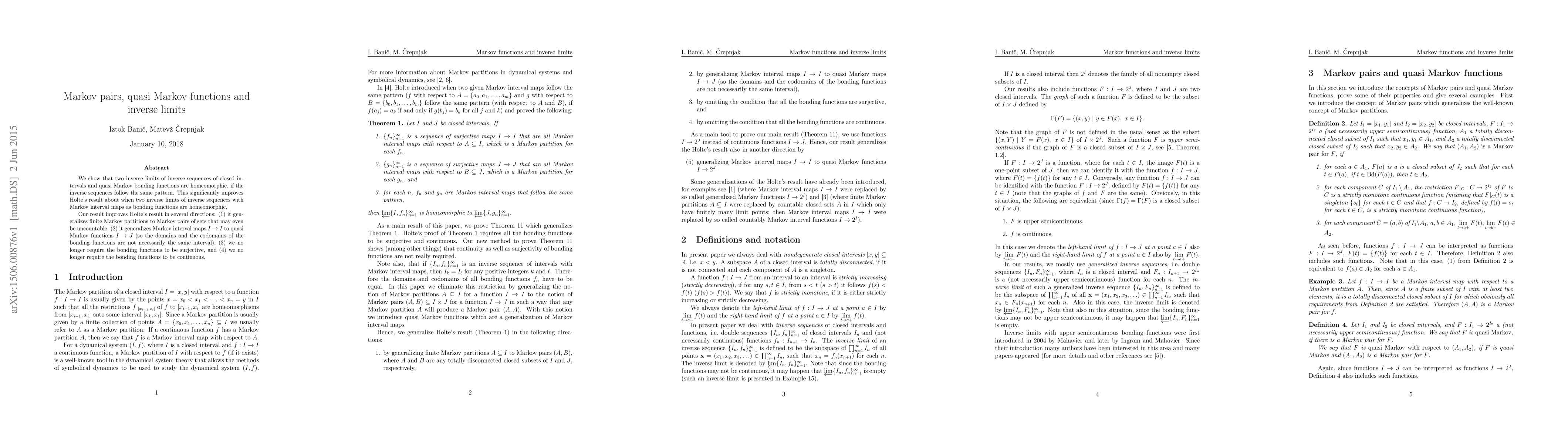 We show that two inverse limits of inverse sequences of closed intervals and quasi Markov bonding functions are homeomorphic, if the inverse sequences follow the same pattern. This significantly improves Holte's result about when two inverse limits of inverse sequences with Markov interval maps as bonding functions are homeomorphic. Our result improves Holte's result in several directions: (1) it generalizes finite Markov partitions to Markov pairs of sets that may even be uncountable, (2) it generalizes Markov interval maps $I\rightarrow I$ to quasi Markov functions $I\rightarrow J$ (so the domains and the codomains of the bonding functions are not necessarily the same interval), (3) we no longer require the bonding functions to be surjective, and (4) we no longer require the bonding functions to be continuous.