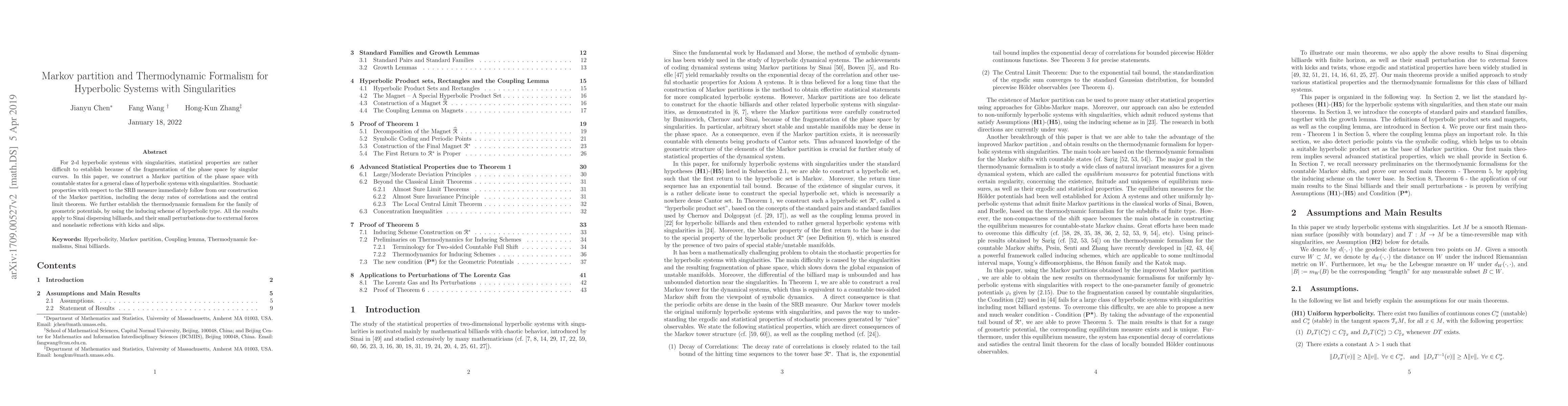 This paper constructs a Markov partition for 2-d hyperbolic systems with singularities, enabling the derivation of stochastic properties and thermodynamic formalism. It applies to Sinai billiards and their perturbations, including decay rates of correlations and the central limit theorem.