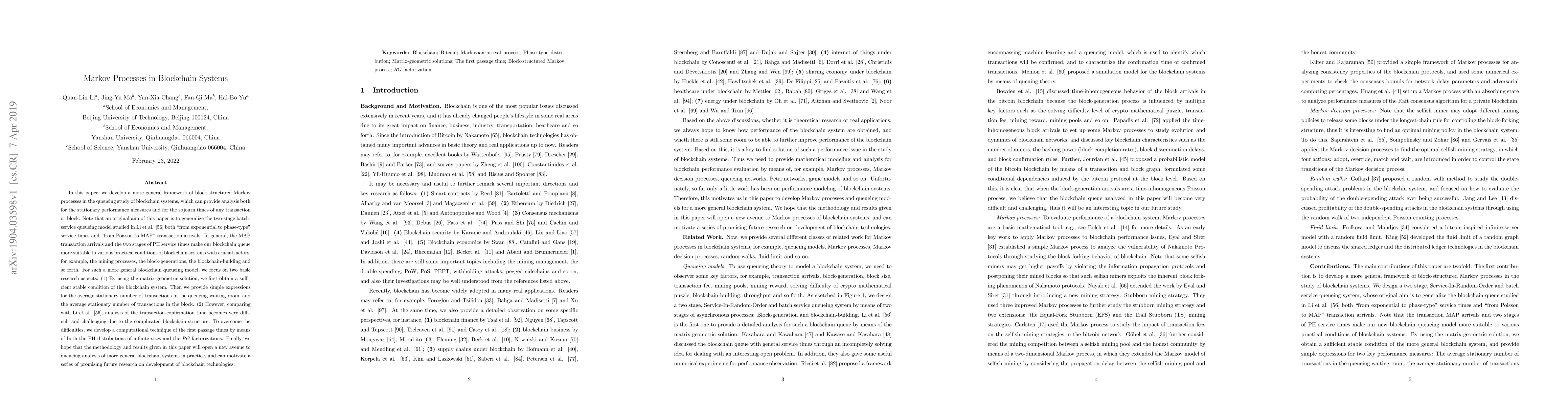 This paper develops a generalized framework of block-structured Markov processes for analyzing blockchain systems, focusing on both stationary performance measures and transaction sojourn times. The authors extend the two-stage batch-service queueing model to accommodate phase-type service times and Markov arrival processes, aiming to better reflect practical blockchain conditions.