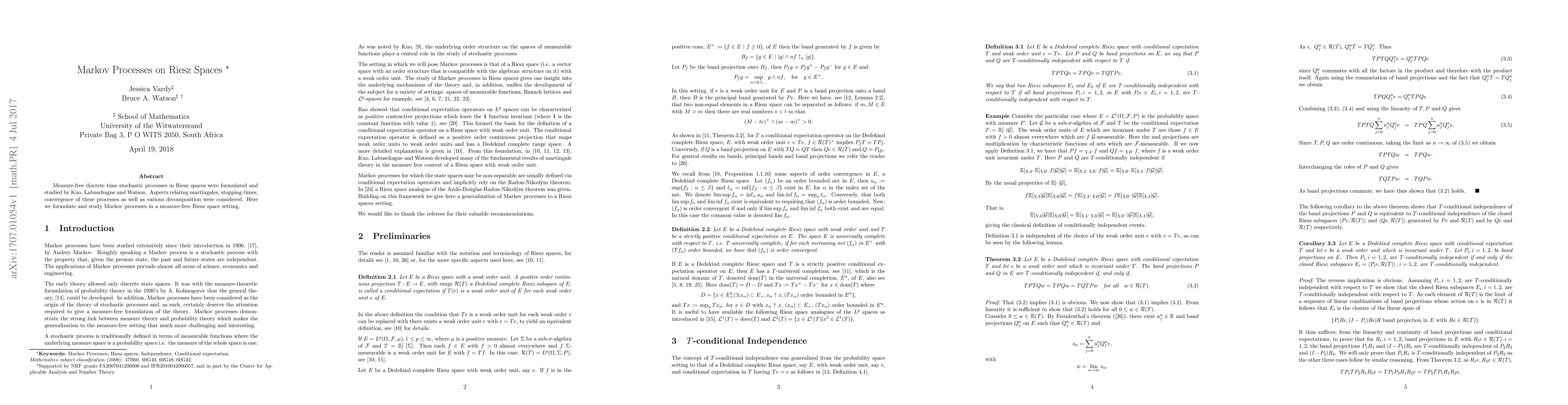 Measure-free discrete time stochastic processes in Riesz spaces were formulated and studied by Kuo, Labuschagne and Watson. Aspects relating martingales, stopping times, convergence of these processes as well as various decomposition were considered. Here we formulate and study Markov processes in a measure-free Riesz space setting.