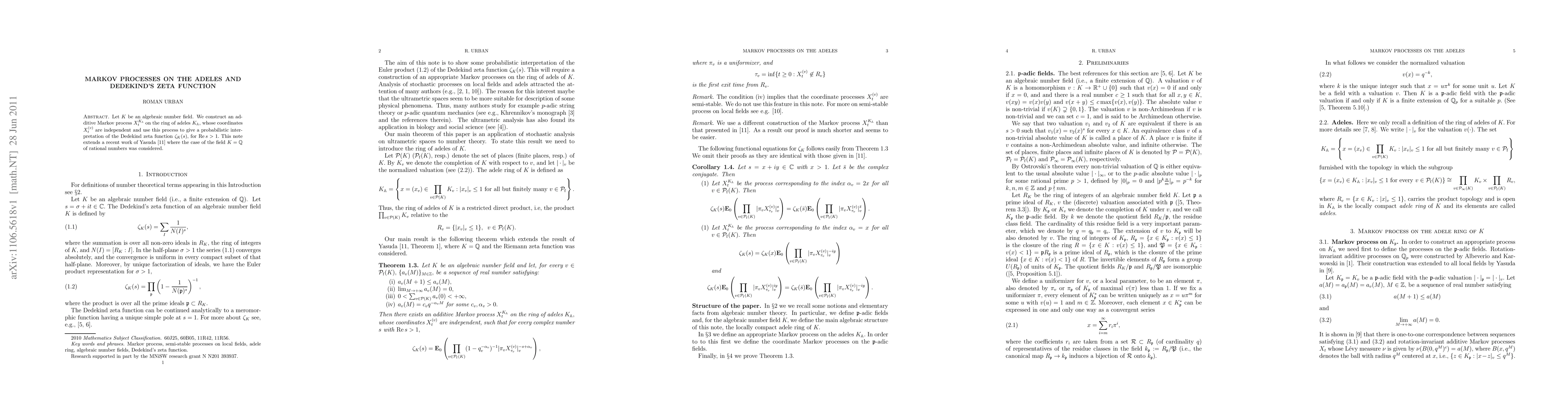 Let $K$ be an algebraic number field. We construct an additive Markov process $X_t^{K_\mathbb A}$ on the ring of adeles $K_\mathbb A,$ whose coordinates $X_t^{(v)}$ are independent and use this process to give a probabilistic interpretation of the Dedekind zeta function $\zeta_K(s),$ for $\re s>1.$ This note extends a recent work of Yasuda [J. Theor. Probab. 23(3):748--769, 2010] where the case of the field $K=\Q$ of rational numbers was considered.