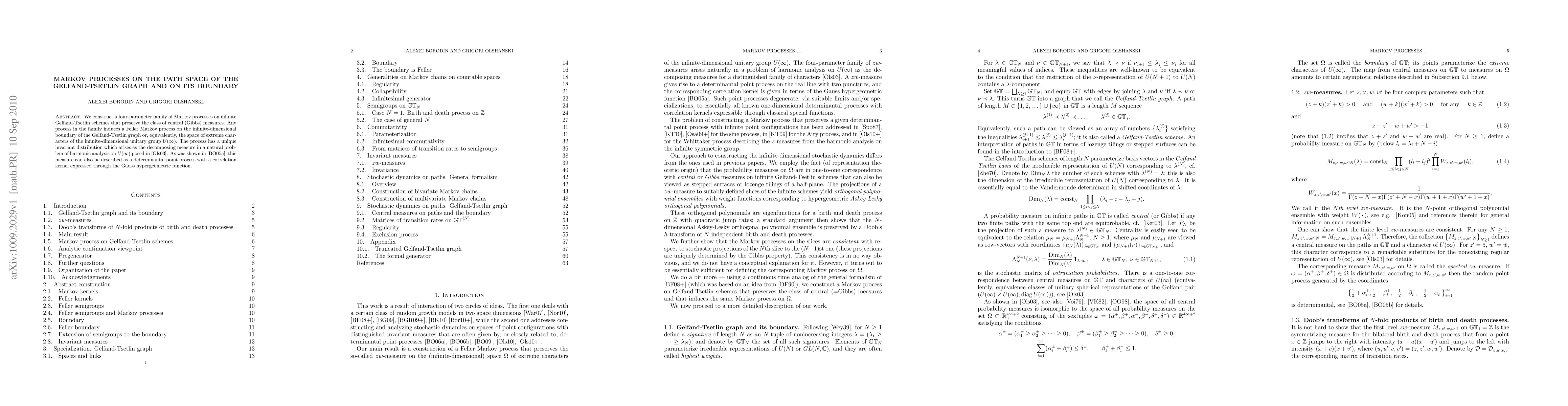 We construct a four-parameter family of Markov processes on infinite Gelfand-Tsetlin schemes that preserve the class of central (Gibbs) measures. Any process in the family induces a Feller Markov process on the infinite-dimensional boundary of the Gelfand-Tsetlin graph or, equivalently, the space of extreme characters of the infinite-dimensional unitary group U(infinity). The process has a unique invariant distribution which arises as the decomposing measure in a natural problem of harmonic analysis on U(infinity) posed in arXiv:math/0109193. As was shown in arXiv:math/0109194, this measure can also be described as a determinantal point process with a correlation kernel expressed through the Gauss hypergeometric function.