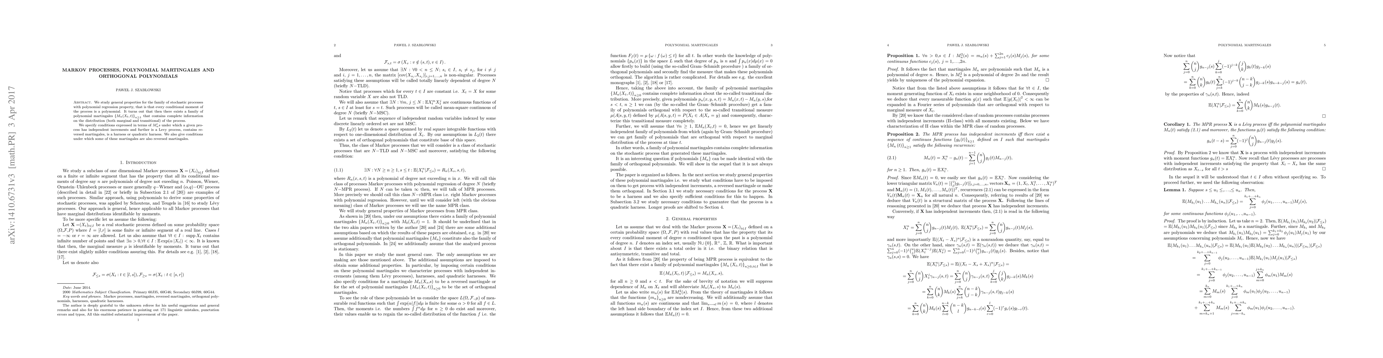 We study general properties for the family of stochastic processes with polynomial regression property, that is that every conditional moment of the process is a polynomial. It turns out that then there exists a family of polynomial martingales $\left\{ M_{n}(X_{t},t)\right\}_{n\geq1}$ that contains complete information on the distribution (both marginal and transitional) of the process. We specify conditions expressed in terms of $M_{n}^{\prime}s$ under which a given process has independent increments and further is a Levy process, contains reversed martingales, is a harness or quadratic harness. We also give conditions under which some of these martingales are also reversed martingales.