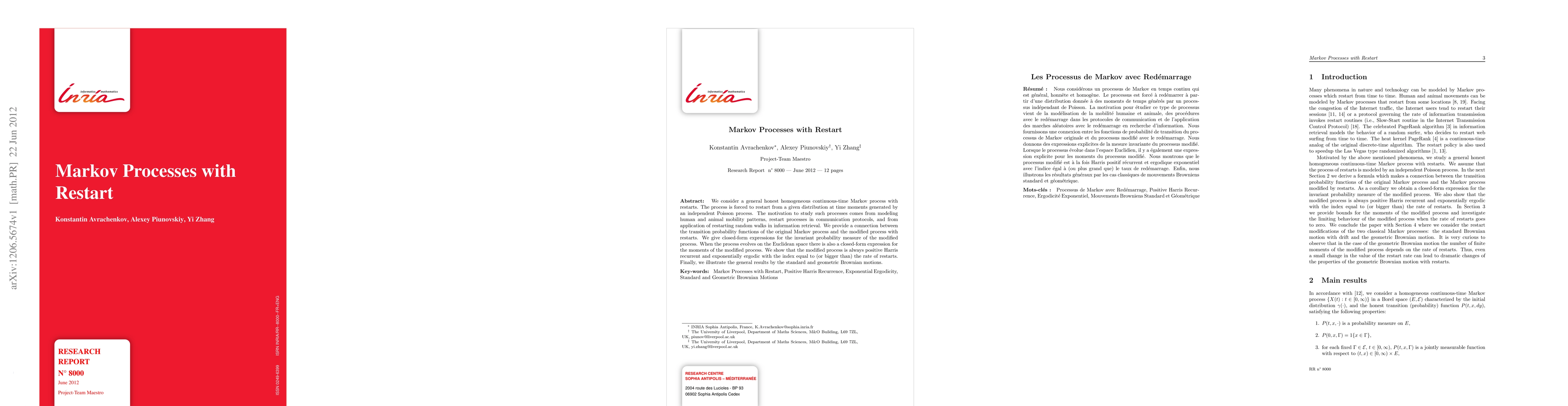We consider a general honest homogeneous continuous-time Markov process with restarts. The process is forced to restart from a given distribution at time moments generated by an independent Poisson process. The motivation to study such processes comes from modeling human and animal mobility patterns, restart processes in communication protocols, and from application of restarting random walks in information retrieval. We provide a connection between the transition probability functions of the original Markov process and the modified process with restarts. We give closed-form expressions for the invariant probability measure of the modified process. When the process evolves on the Euclidean space there is also a closed-form expression for the moments of the modified process. We show that the modified process is always positive Harris recurrent and exponentially ergodic with the index equal to (or bigger than) the rate of restarts. Finally, we illustrate the general results by the standard and geometric Brownian motions.