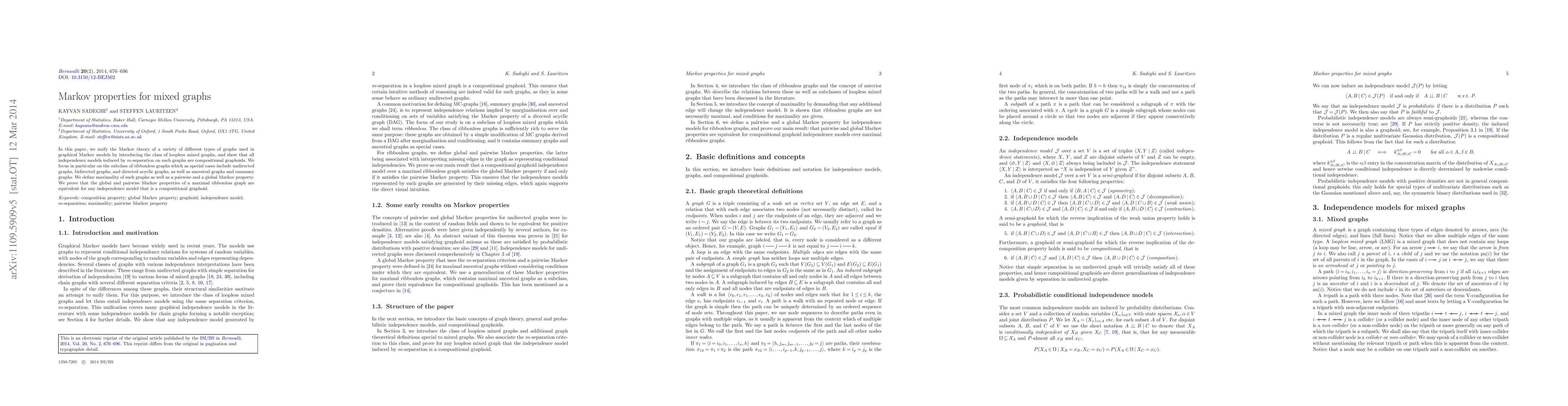 This paper extends Markov theory to loopless mixed graphs, showing that all independence models induced by $m$-separation are compositional graphoids. It establishes maximality and Markov properties for a subclass of ribbonless graphs, proving equivalence between global and pairwise Markov properties for these graphs.