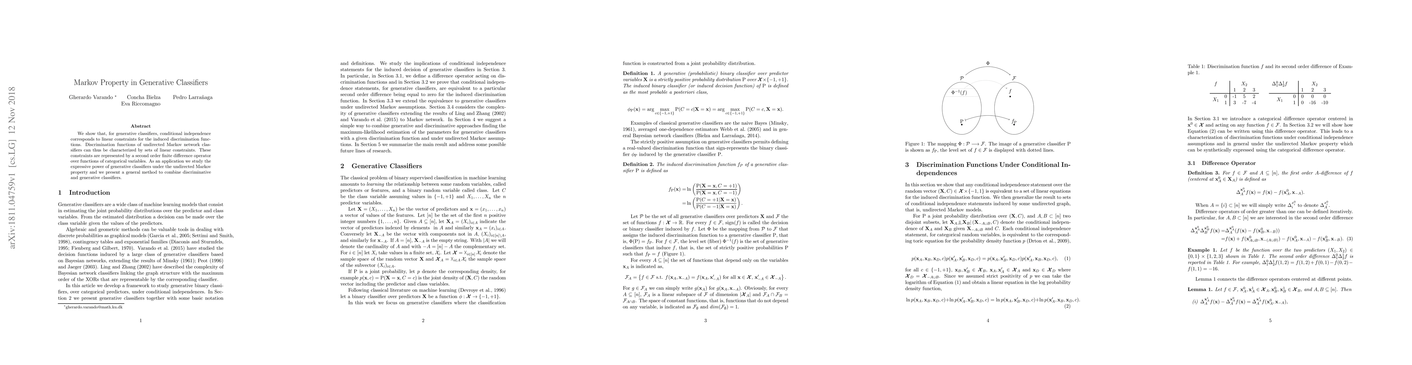 This paper demonstrates that conditional independence in generative classifiers translates to linear constraints on discrimination functions, which can be characterized by a second-order finite difference operator. It also explores the expressive power of generative classifiers under the undirected Markov property and proposes a method to integrate discriminative and generative classifiers.