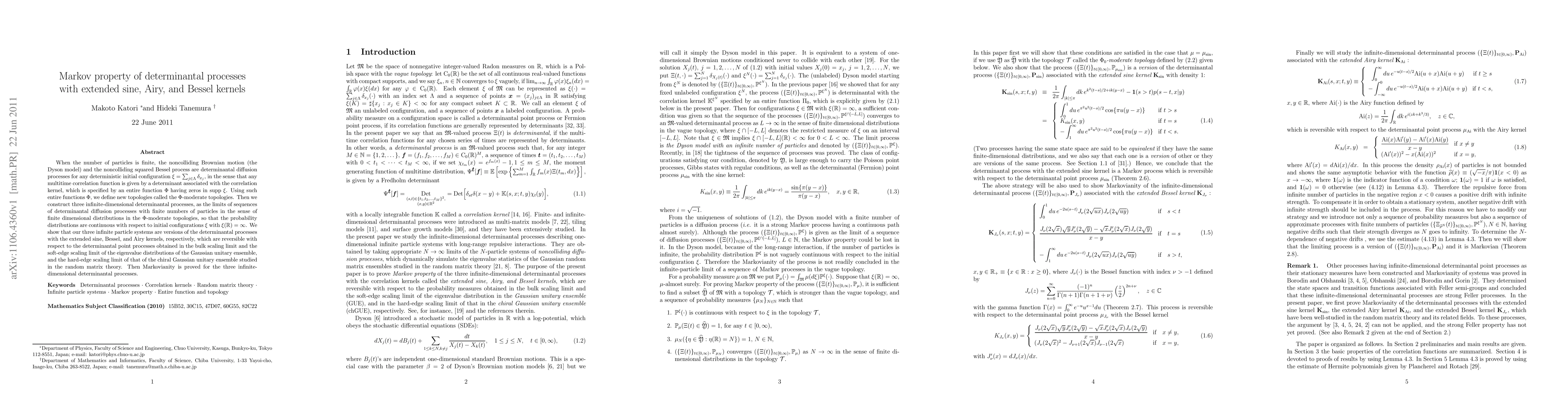 When the number of particles is finite, the noncolliding Brownian motion (the Dyson model) and the noncolliding squared Bessel process are determinantal diffusion processes for any deterministic initial configuration $\xi=\sum_{j \in \Lambda} \delta_{x_j}$, in the sense that any multitime correlation function is given by a determinant associated with the correlation kernel, which is specified by an entire function $\Phi$ having zeros in $\supp \xi$. Using such entire functions $\Phi$, we define new topologies called the $\Phi$-moderate topologies. Then we construct three infinite-dimensional determinantal processes, as the limits of sequences of determinantal diffusion processes with finite numbers of particles in the sense of finite dimensional distributions in the $\Phi$-moderate topologies, so that the probability distributions are continuous with respect to initial configurations $\xi$ with $\xi(\R)=\infty$. We show that our three infinite particle systems are versions of the determinantal processes with the extended sine, Bessel, and Airy kernels, respectively, which are reversible with respect to the determinantal point processes obtained in the bulk scaling limit and the soft-edge scaling limit of the eigenvalue distributions of the Gaussian unitary ensemble, and the hard-edge scaling limit of that of the chiral Gaussian unitary ensemble studied in the random matrix theory. Then Markovianity is proved for the three infinite-dimensional determinantal processes.