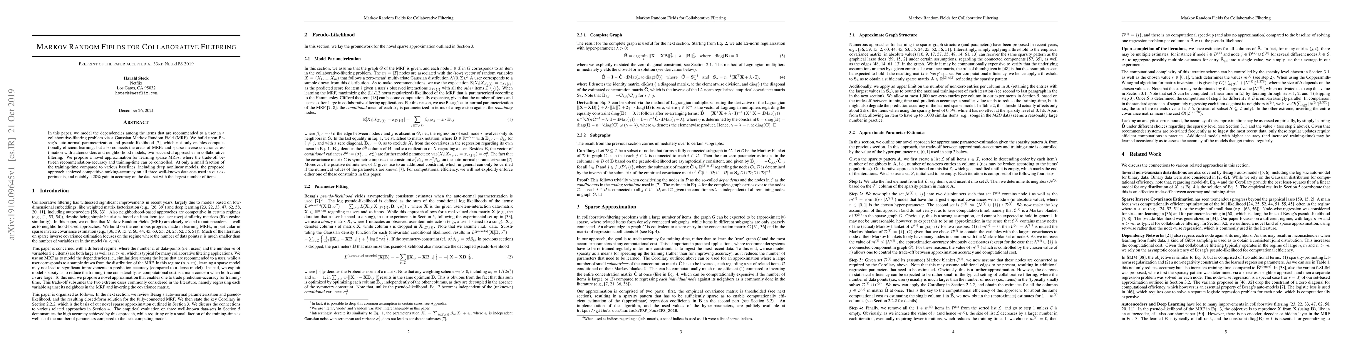 This paper proposes a novel Gaussian Markov Random Field (MRF) model for collaborative filtering that leverages Besag's auto-normal parameterization and pseudo-likelihood for efficient learning. The approach achieves competitive recommendation accuracy with significantly reduced training time compared to deep models, showing a notable 20% improvement on a dataset with many items.
