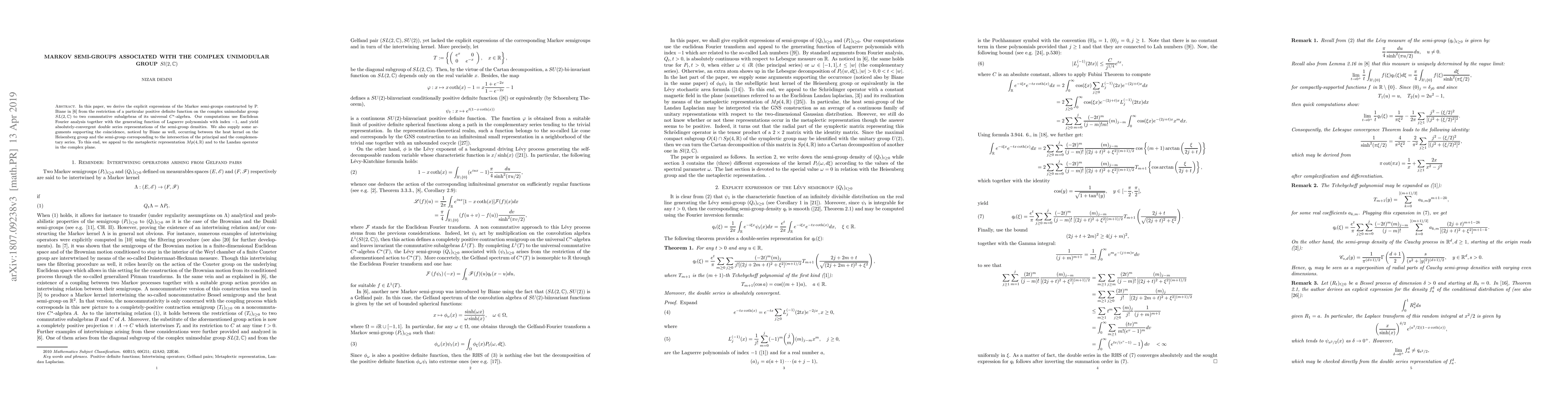 In this paper, we derive the explicit expressions of two Markov semi-groups constructed by P. Biane in \cite{Bia1} from the restriction of a particular positive definite function on the complex unimodular group $Sl(2,\mathbb{C})$ to two commutative subalgebras of its universal $C^{\star}$-algebra. Our computations use Euclidean Fourier analysis together with the generating function of Laguerre polynomials with index $-1$, and yield absolutely-convergent double series representations of the semi-group densities. In the last part of the paper, we discuss the coincidence, noticed by Biane as well, occurring between the heat kernel on the Heisenberg group and the semi-group corresponding to the intersection of the principal and the complementary series. To this end, we appeal to the metaplectic representation $Mp(4,\mathbb{R})$ and to the Landau operator in the complex plane.