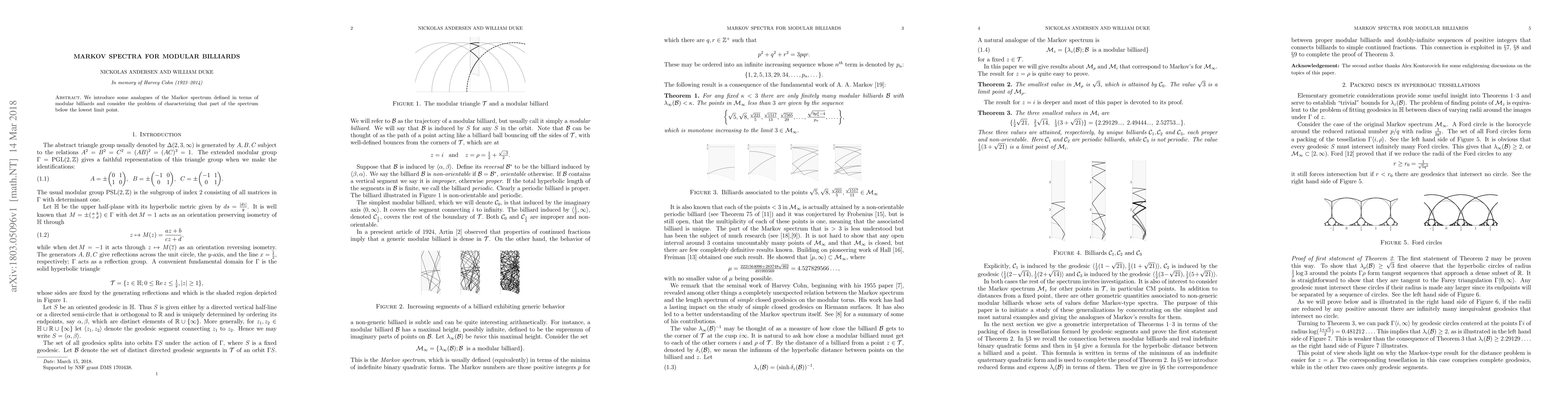 Summary: This paper explores analogues of the Markov spectrum in modular billiards and investigates the characterization of the spectrum segment below the lowest limit point. The focus is on understanding the properties of modular billiard systems through this mathematical lens.