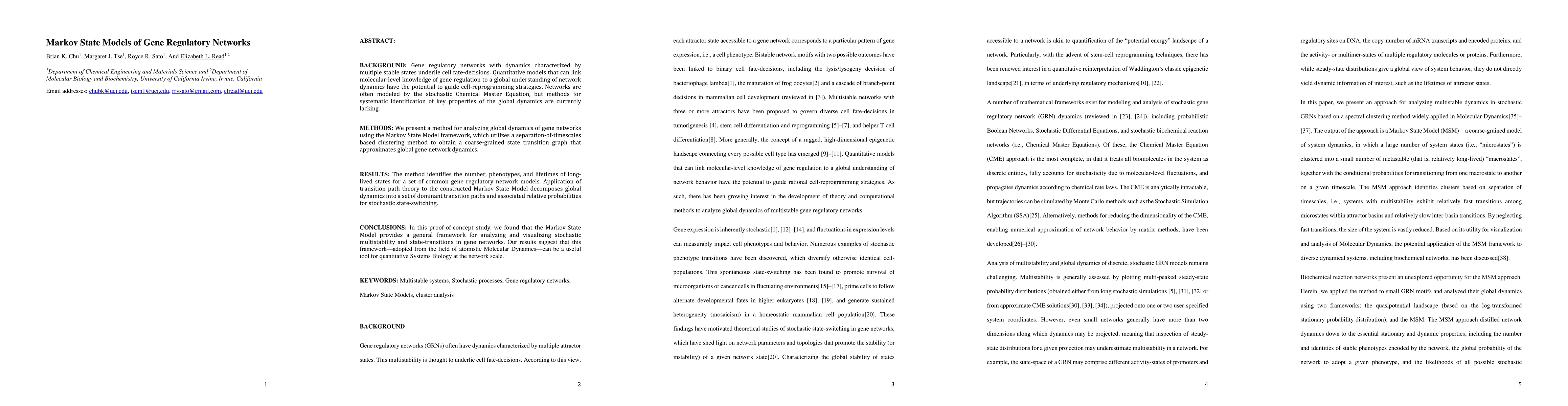This paper introduces a Markov State Model (MSM) framework to analyze the global dynamics of gene regulatory networks, identifying long-lived states and dominant transition paths. The MSM approach offers a systematic method for understanding stochastic multistability and state-switching, suggesting its utility in Systems Biology for cell-reprogramming strategies.