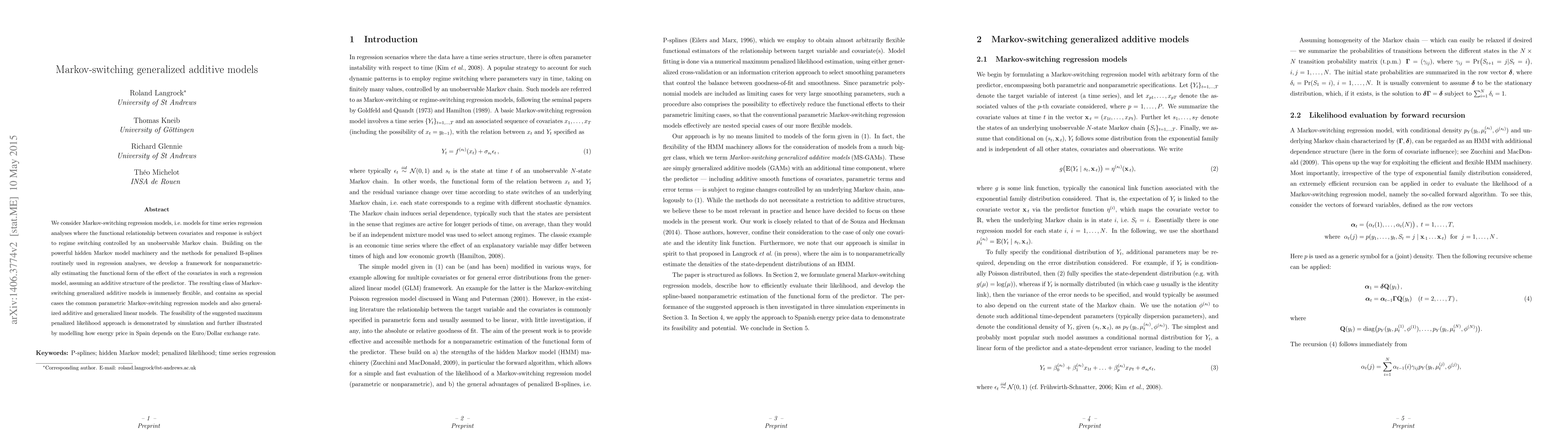 This paper develops a Markov-switching generalized additive model for time series regression, allowing for regime-switching functional relationships controlled by an unobservable Markov chain. The proposed method uses penalized B-splines for nonparametric estimation and is demonstrated through simulations and an application to modeling energy price dynamics in Spain.
