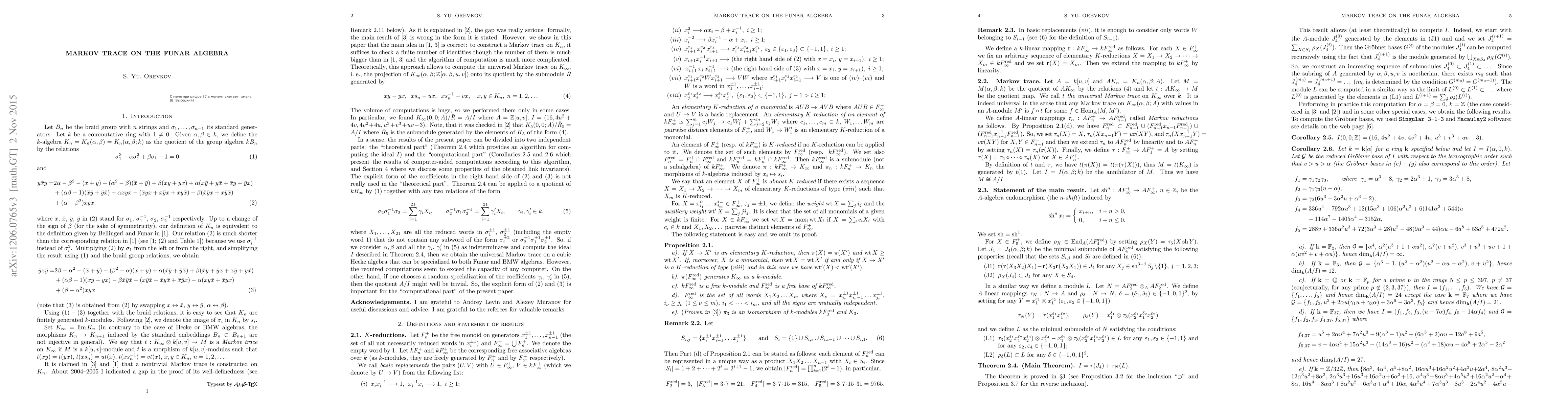 Funar algebra $K_\infty=K_\infty(\alpha,\beta;k)$ is the quotient of the group algebra over a ring $k$ of the braid group $B_\infty$ by two cubic relations: $\sigma_1^3-\alpha\sigma_1^2+\beta\sigma_1-1=0$ and another one which involves $\sigma_1$ and $\sigma_2$. The universal Markov trace on $K_\infty$ is the quotient map $t$ of $K_\infty(\alpha,\beta,k[u,v])$ to its quotient (as a $k[u,v]$-module) by trace relations $xy=yx$ and by Markov relations $\sigma_nx=ux$, $\sigma_n^{-1}x=vx$ for $x\in K_n$. It is easy to check that the quotient is of the form $k[u,v]/I$ for some ideal $I$ (i. e. that the trace $t$ is determined by $t(1)$). We give an algorithm to compute the ideal $I$ and we present the result of computations in some special cases. In the last section we discuss some properties of the resulting link invariant. This invariant for $\beta=0$, $k=GF(37)[\alpha]$ detects the chirality of the knots $10_{48}$ and $10_{91}$ and it distinguish many other pairs of knots with equal HOMFLY polynomials.