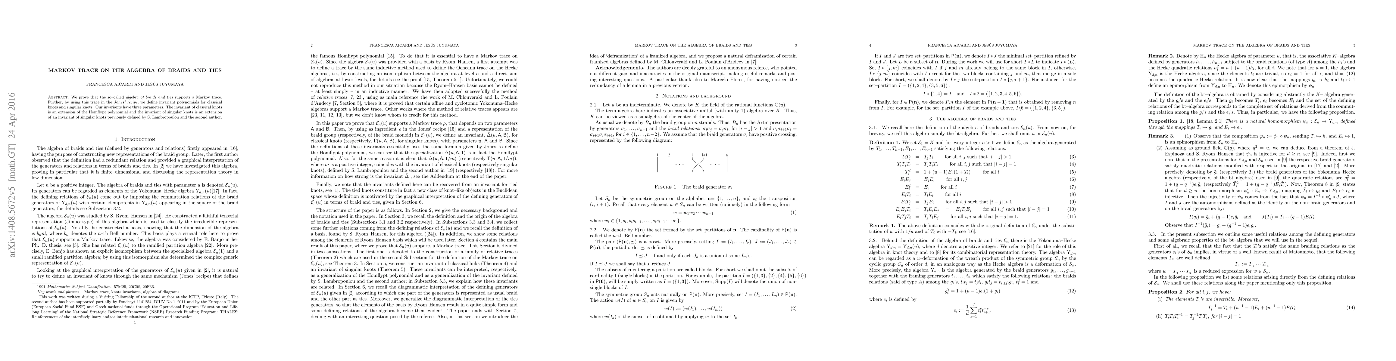 We prove that the so-called t algebra of braids and ties supports a Markov trace. Further, by using this trace in the Jones' recipe, we define invariant polynomials for classical knots and singular knots. Our invariants have three parameters. The invariant of classical knots is an extension of the Homflypt polynomial and the invariant of singular knots is an extension of an invariant of singular knots previously defined by S. Lambropoulou and the second author.