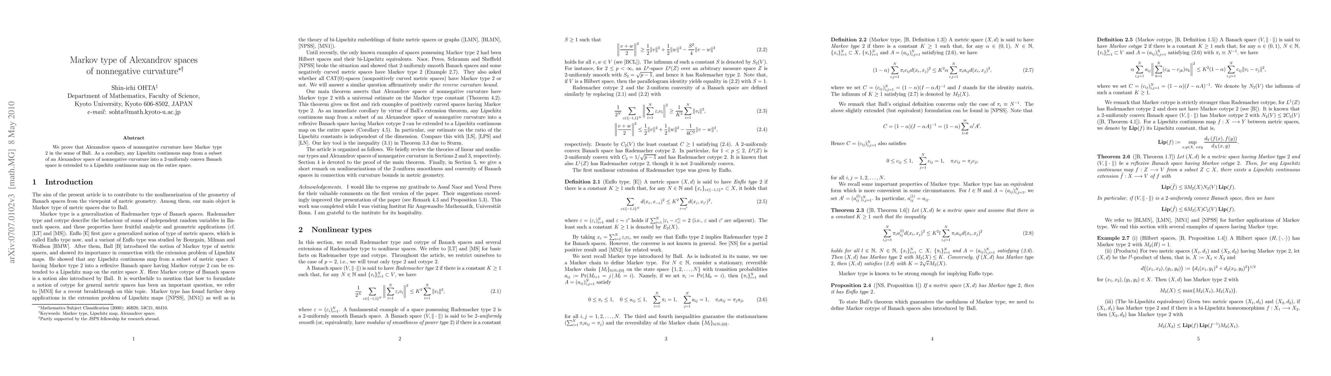 The paper proves that Alexandrov spaces of nonnegative curvature have Markov type 2 using a probabilistic approach, leveraging the Markov cotype and Markov type concepts from functional analysis.