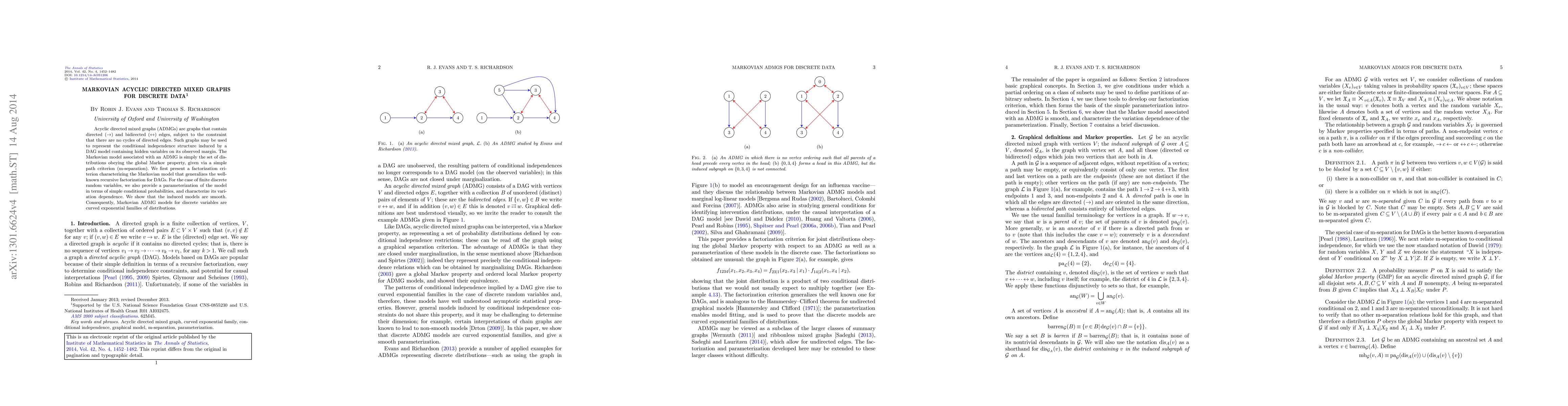 Acyclic directed mixed graphs (ADMGs) are graphs that contain directed ($\rightarrow$) and bidirected ($\leftrightarrow$) edges, subject to the constraint that there are no cycles of directed edges. Such graphs may be used to represent the conditional independence structure induced by a DAG model containing hidden variables on its observed margin. The Markovian model associated with an ADMG is simply the set of distributions obeying the global Markov property, given via a simple path criterion (m-separation). We first present a factorization criterion characterizing the Markovian model that generalizes the well-known recursive factorization for DAGs. For the case of finite discrete random variables, we also provide a parameterization of the model in terms of simple conditional probabilities, and characterize its variation dependence. We show that the induced models are smooth. Consequently, Markovian ADMG models for discrete variables are curved exponential families of distributions.