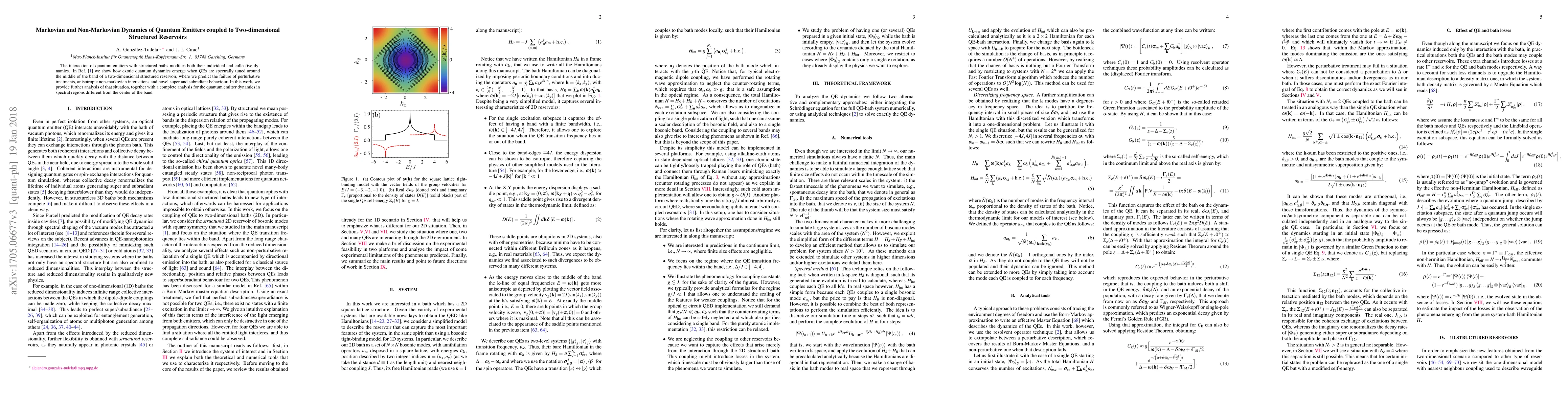 The interaction of quantum emitters with structured baths modifies both their individual and collective dynamics. In Gonz\'alez-Tudela \emph{et al} we show how exotic quantum dynamics emerge when QEs are spectrally tuned around the middle of the band of a two-dimensional structured reservoir, where we predict the failure of perturbative treatments, anisotropic interactions and novel super and subradiant behaviour. In this work, we provide further analysis of that situation, together with a complete analysis for the quantum emitter dynamics in spectral regions different from the center of the band.