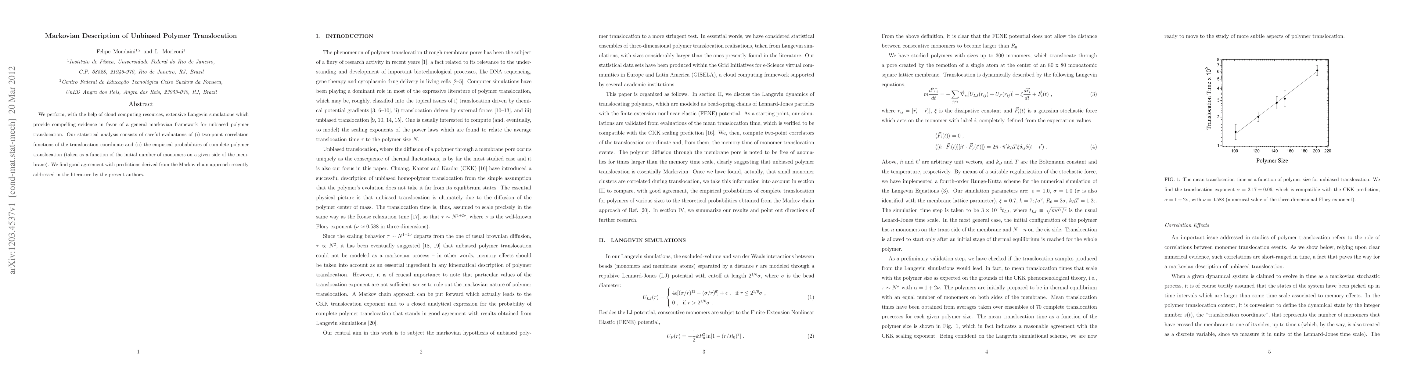 We perform, with the help of cloud computing resources, extensive Langevin simulations which provide compelling evidence in favor of a general markovian framework for unbiased polymer translocation. Our statistical analysis consists of careful evaluations of (i) two-point correlation functions of the translocation coordinate and (ii) the empirical probabilities of complete polymer translocation (taken as a function of the initial number of monomers on a given side of the membrane). We find good agreement with predictions derived from the Markov chain approach recently addressed in the literature by the present authors.