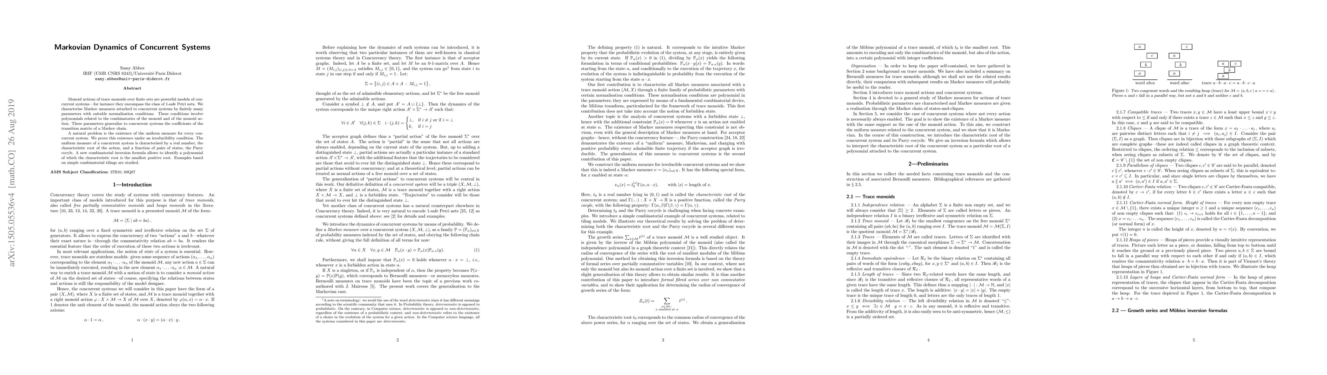 Monoid actions of trace monoids over finite sets are powerful models of concurrent systems---for instance they encompass the class of 1-safe Petri nets. We characterise Markov measures attached to concurrent systems by finitely many parameters with suitable normalisation conditions. These conditions involve polynomials related to the combinatorics of the monoid and of the monoid action. These parameters generalise to concurrent systems the coefficients of the transition matrix of a Markov chain. A natural problem is the existence of the uniform measure for every concurrent system. We prove this existence under an irreducibility condition. The uniform measure of a concurrent system is characterised by a real number, the characteristic root of the action, and a function of pairs of states, the Parry cocyle. A new combinatorial inversion formula allows to identify a polynomial of which the characteristic root is the smallest positive root. Examples based on simple combinatorial tilings are studied.