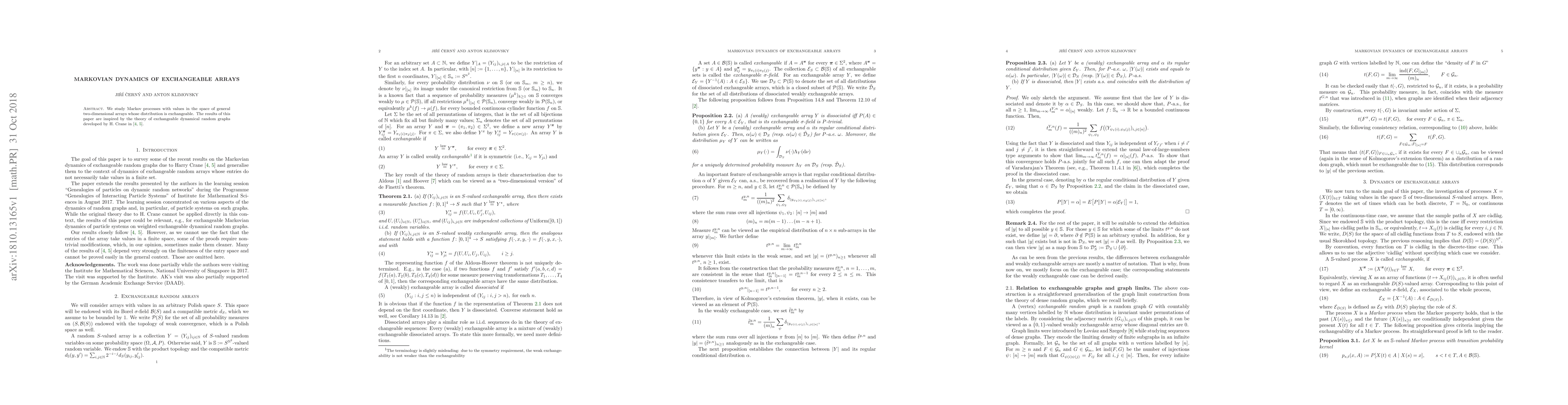 Summary: This paper explores Markov processes defined over exchangeable two-dimensional arrays, drawing inspiration from Crane's theory of exchangeable dynamical random graphs, to understand their probabilistic dynamics.