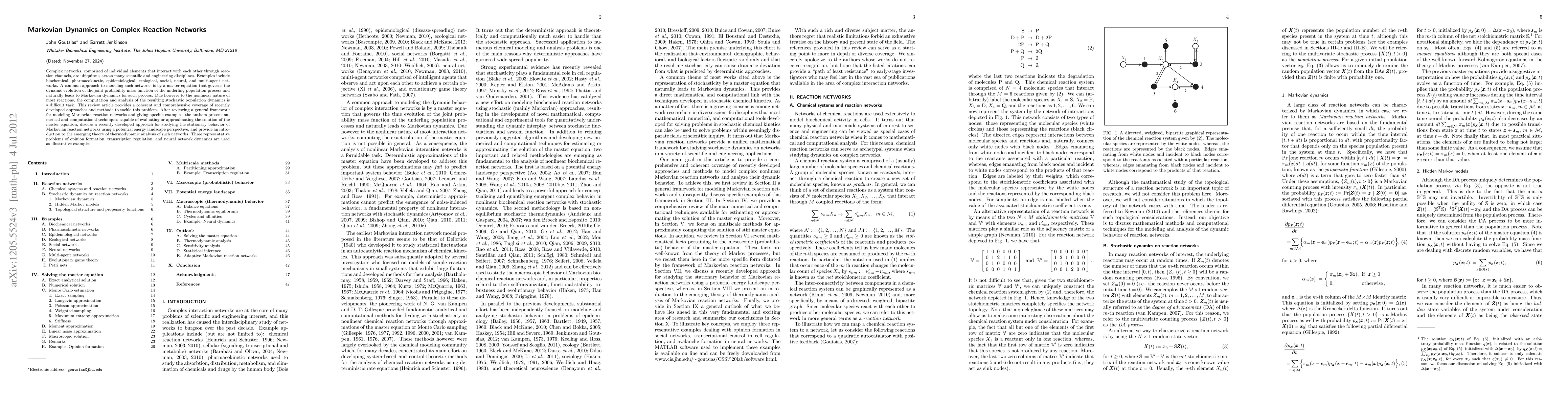 This paper reviews advanced methods for modeling and analyzing Markovian dynamics in complex reaction networks, focusing on computational techniques to address the challenges posed by nonlinear reactions. It discusses numerical approaches, potential energy landscapes, and thermodynamic analysis, using examples from opinion formation, transcription regulation, and neural networks.