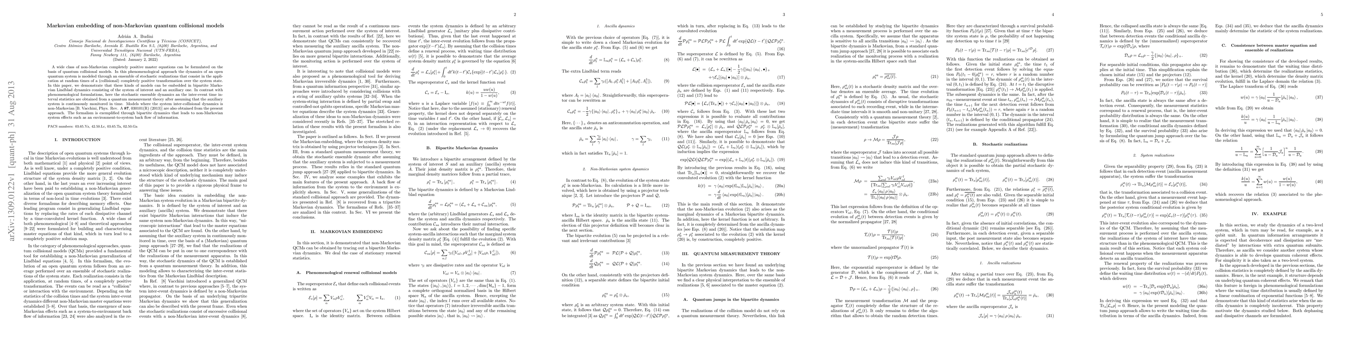 This paper demonstrates that non-Markovian quantum collisional models can be embedded in Markovian Lindblad dynamics by introducing an auxiliary system and assuming continuous monitoring. This approach provides a quantum measurement theory-based framework for stochastic dynamics and inter-event time statistics, contrasting with purely phenomenological models.