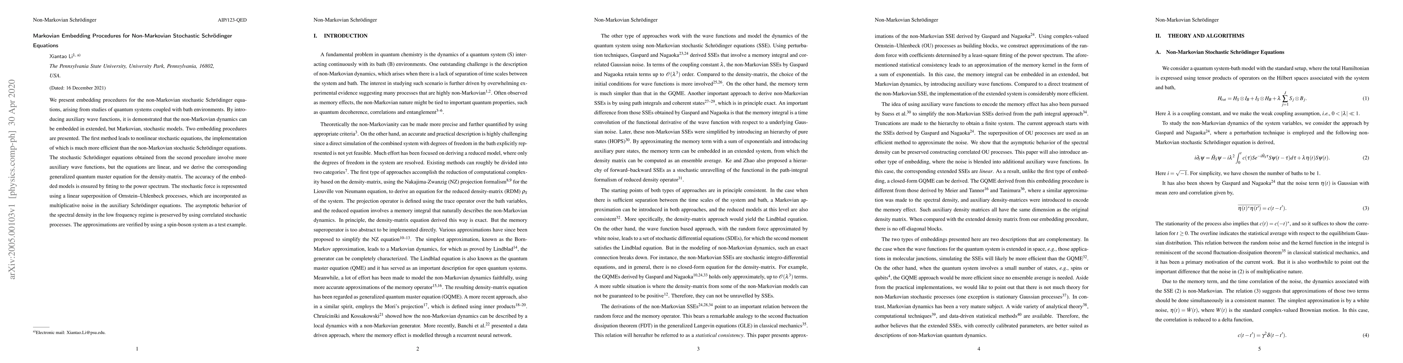 The research presents embedding procedures for non-Markovian stochastic Schrödinger equations, transforming them into extended but Markovian stochastic models using auxiliary wave functions.